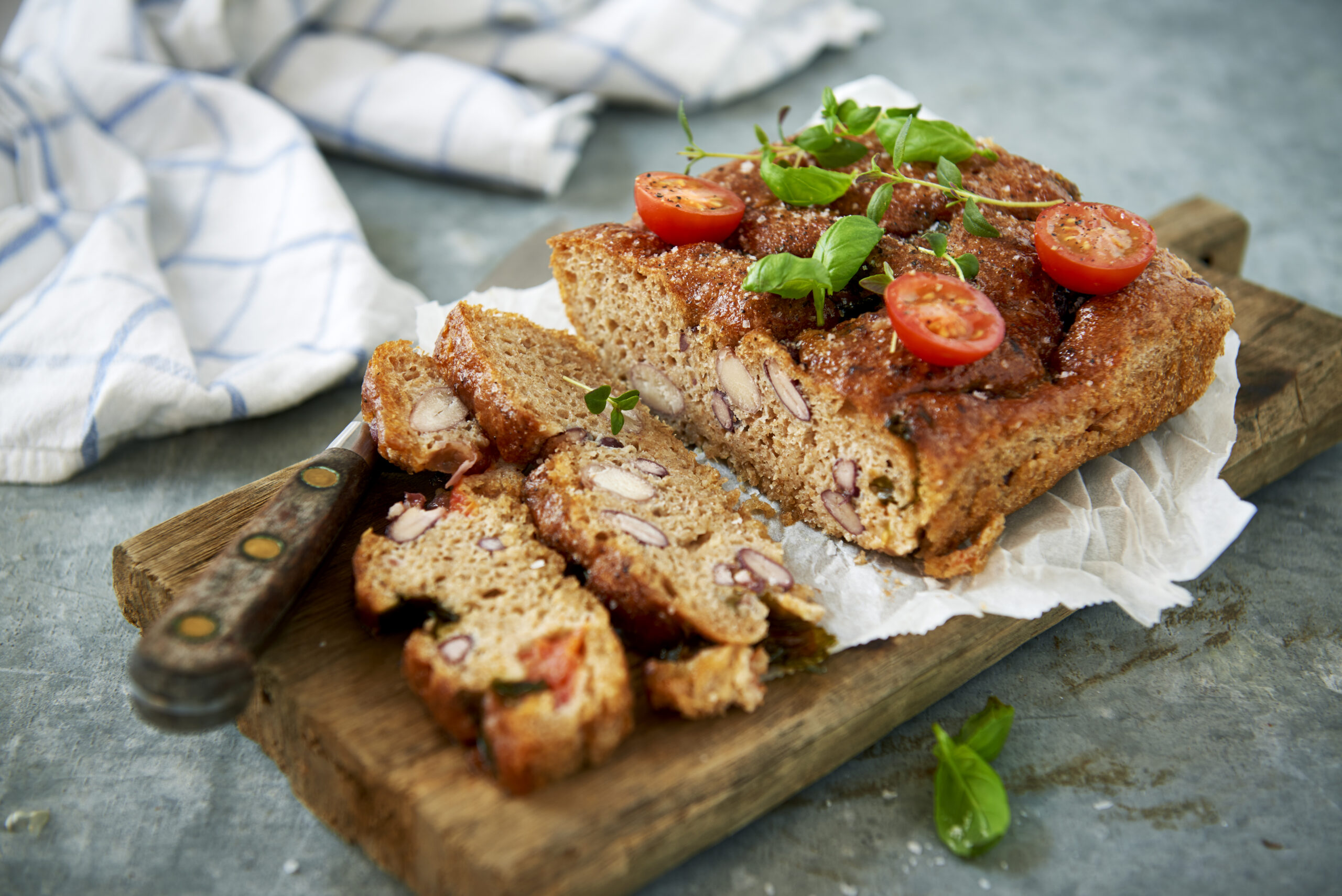 Focaccia med bönor, tomat och basilika