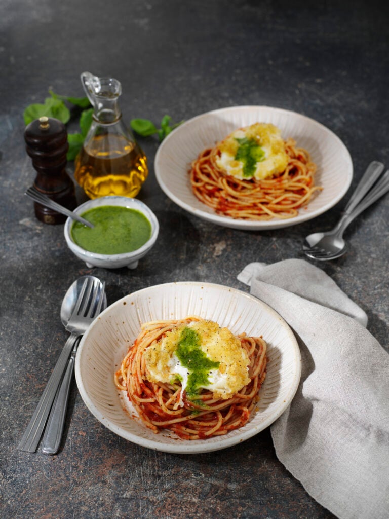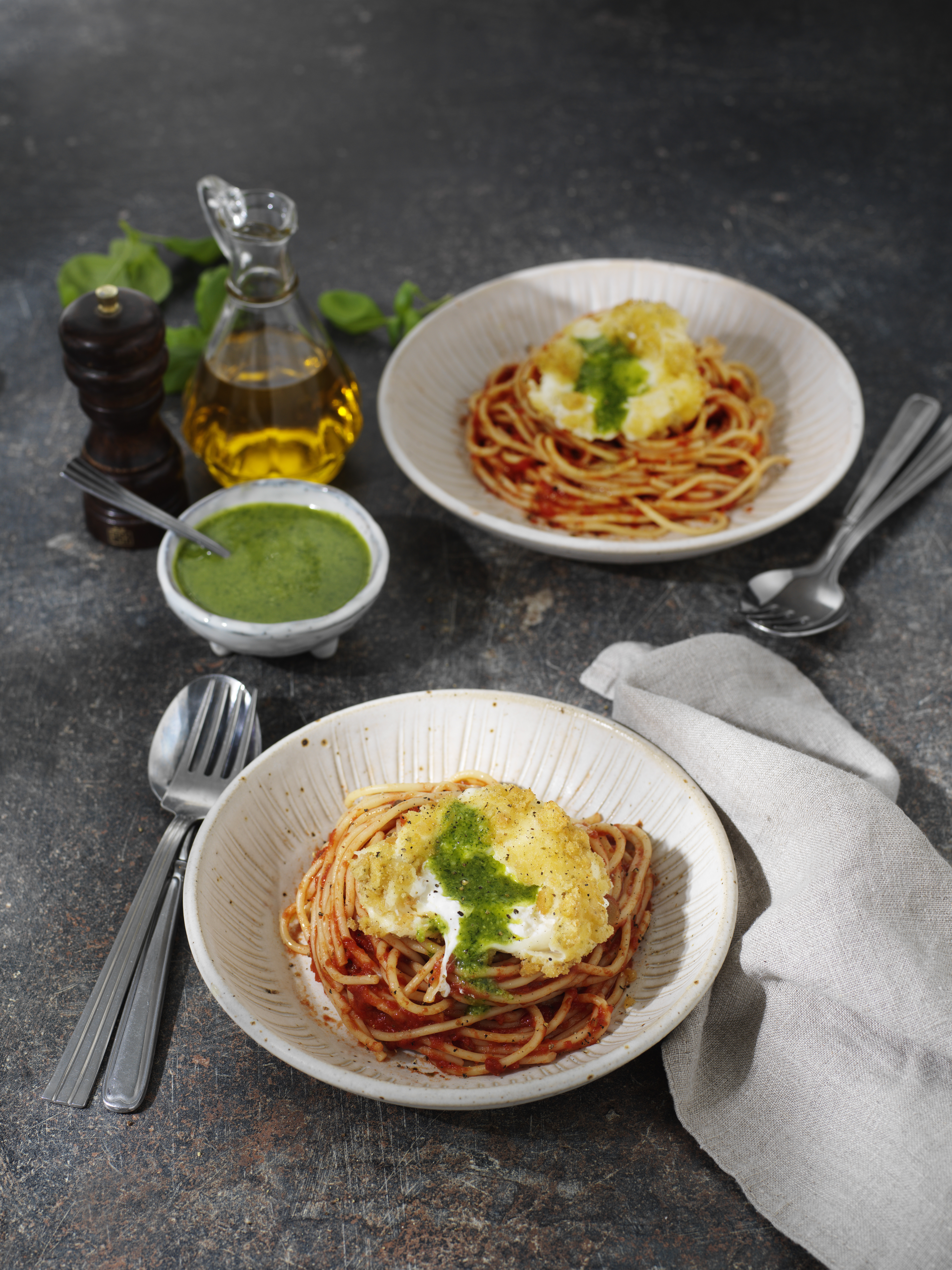 Friterad miniburrata med spaghetti, tomatsås och pesto