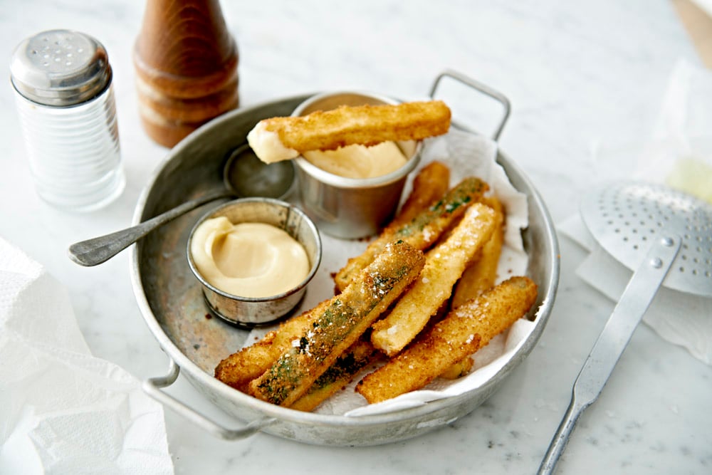 Zucchini frites med två typer av smaksatt majonnäs, en med tryffel och en med smak av sardeller. Goda alternativ till vanliga pommes frites.