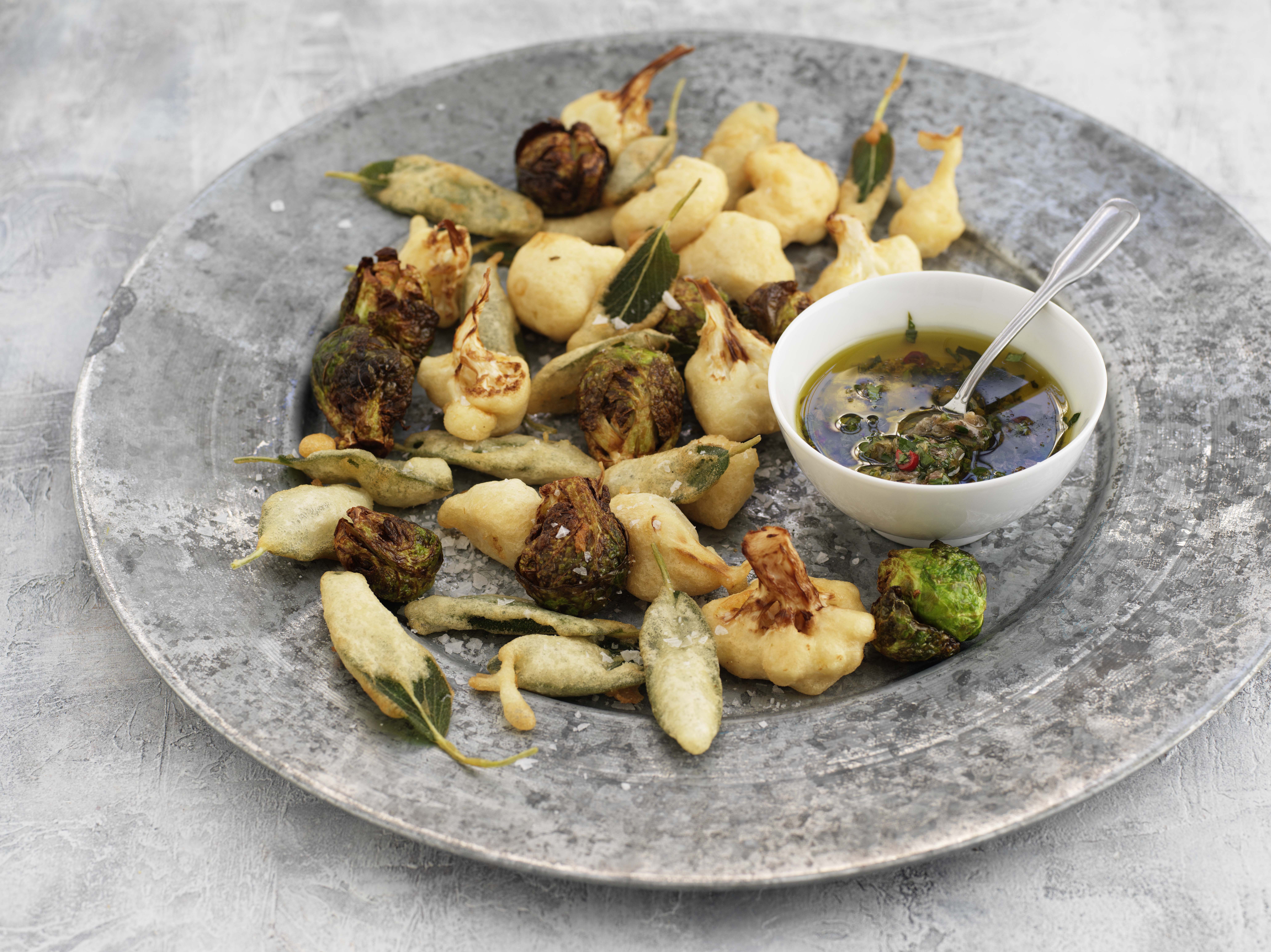 Friterad blomkål, brysselkål och salviablad med en umamifylld sardelldipp, servera som förrätt eller drinktilltugg på festen!