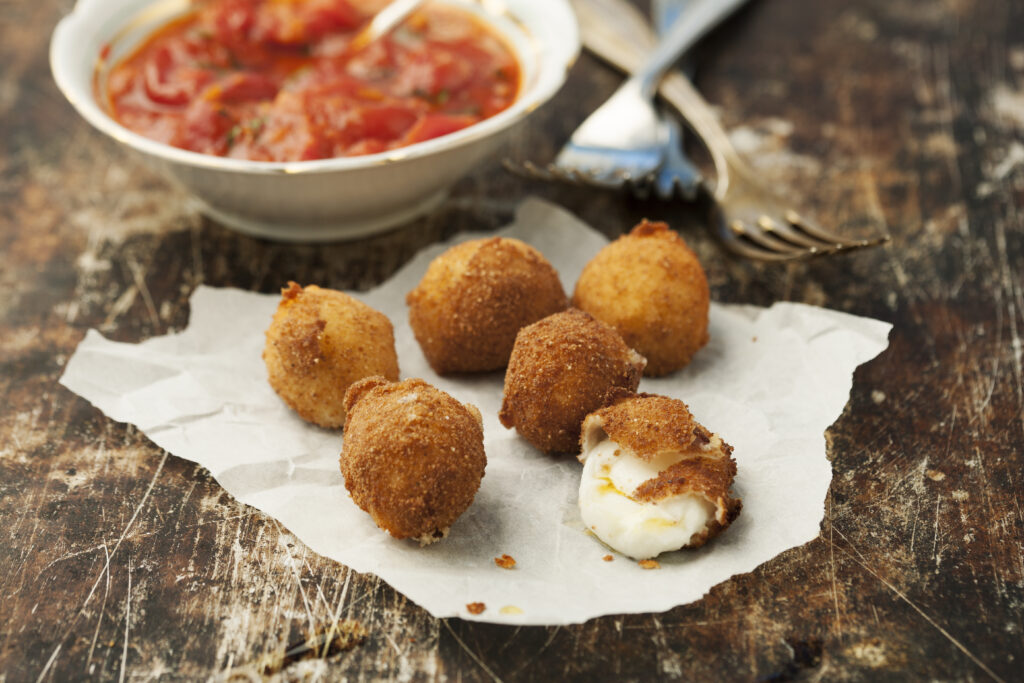 Friterade minimozzarella med arrabiatasås