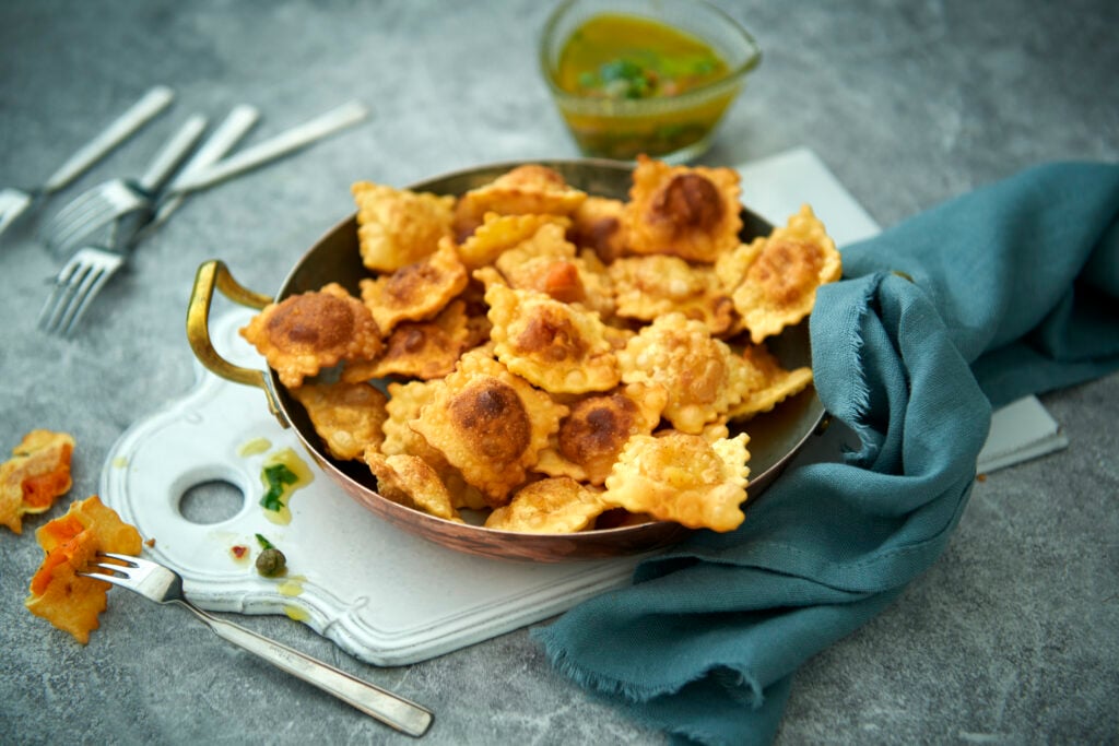 Frasiga friterade ravioli som serveras med en fräsch sardelldipp. Passar utmärkt att servera till många på en buffé eller som tilltugg innan middagen.