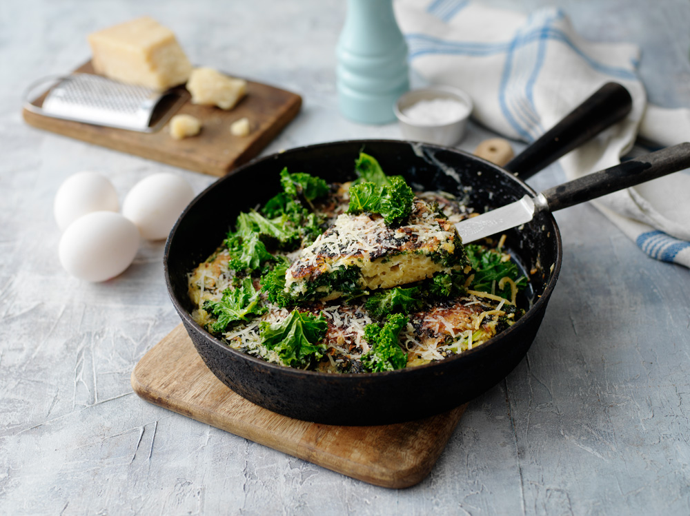 En härlig variant på frittata med grönkål och spaghetti. Perfekt att snabbt laga till när du har lite kall pasta kvar från dagen innan.