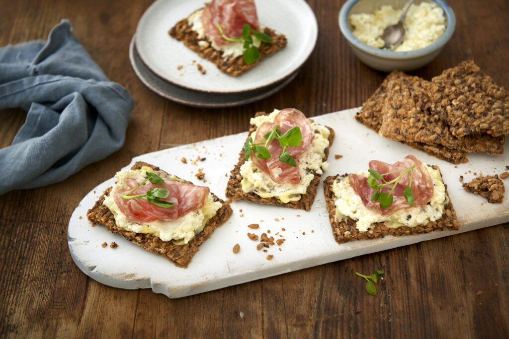Fröknäcke med BreOliv- och fetaoströra som toppas med salami med fänkål och vattenkrasse. BreOliv är ett helt vegetabiliskt fett med bara fyra ingredienser, olivolja, fett från sheanötter, vatten och salt.