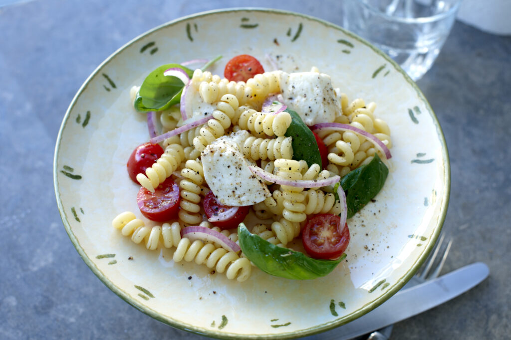 När du inte har tid att laga men ändå vill äta gott – mozzarella, cocktailtomater och rödlök till pasta i glada skruvar