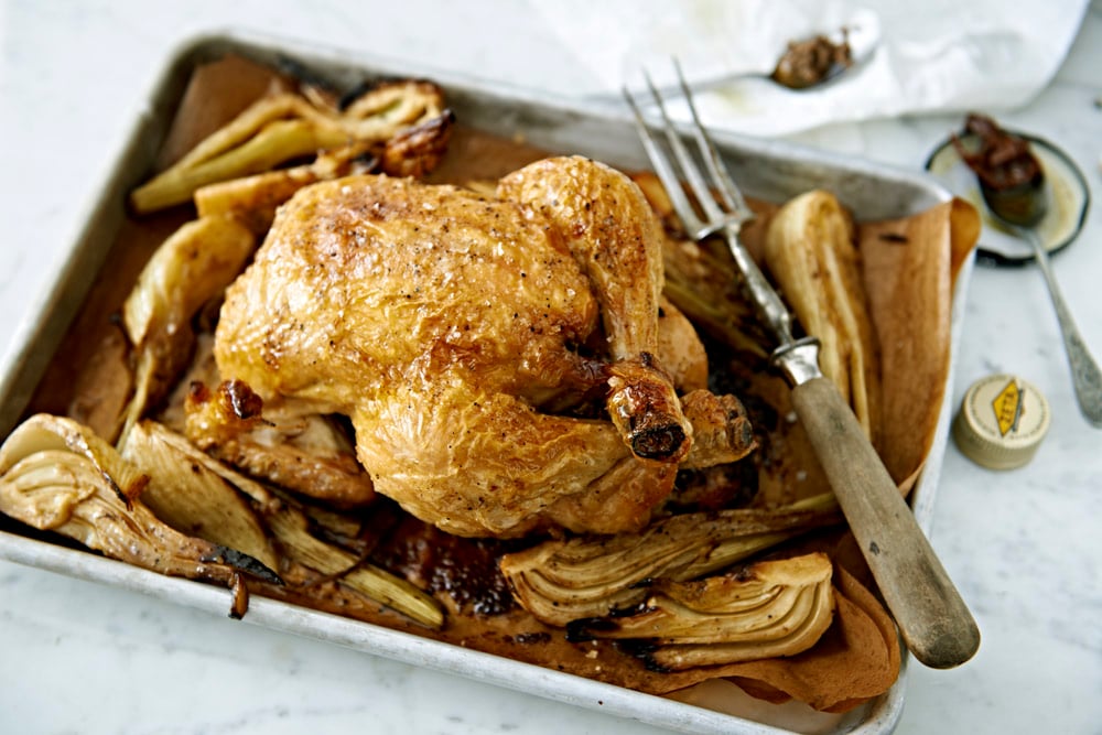 Helgrillad kyckling i ugn med kronärtsskockor och soltorkade tomater