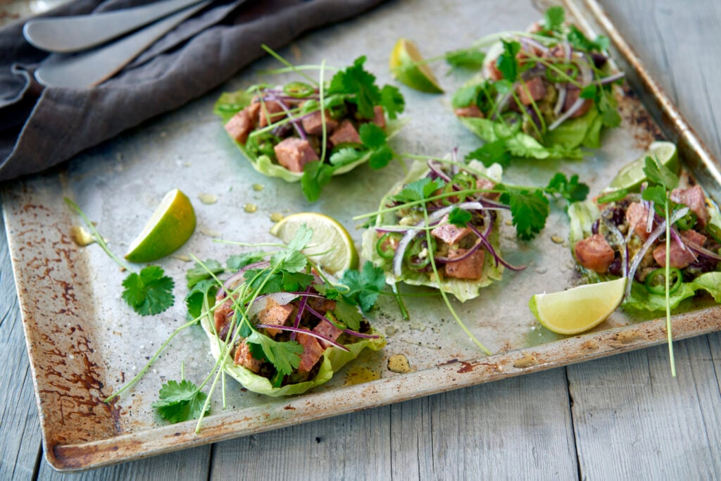 Fräsch smakrik rätt med salladsblad fyllda med kidneybönor, avokado och salsiccia.