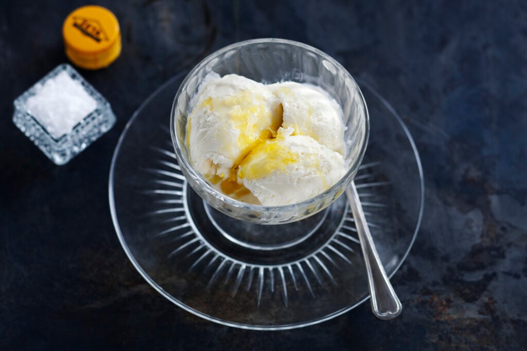 Glass med smaksatt olivolja är en enkel och överraskande dessert från Italien. Havssaltet ger en perfekt brytning mellan sött och salt.