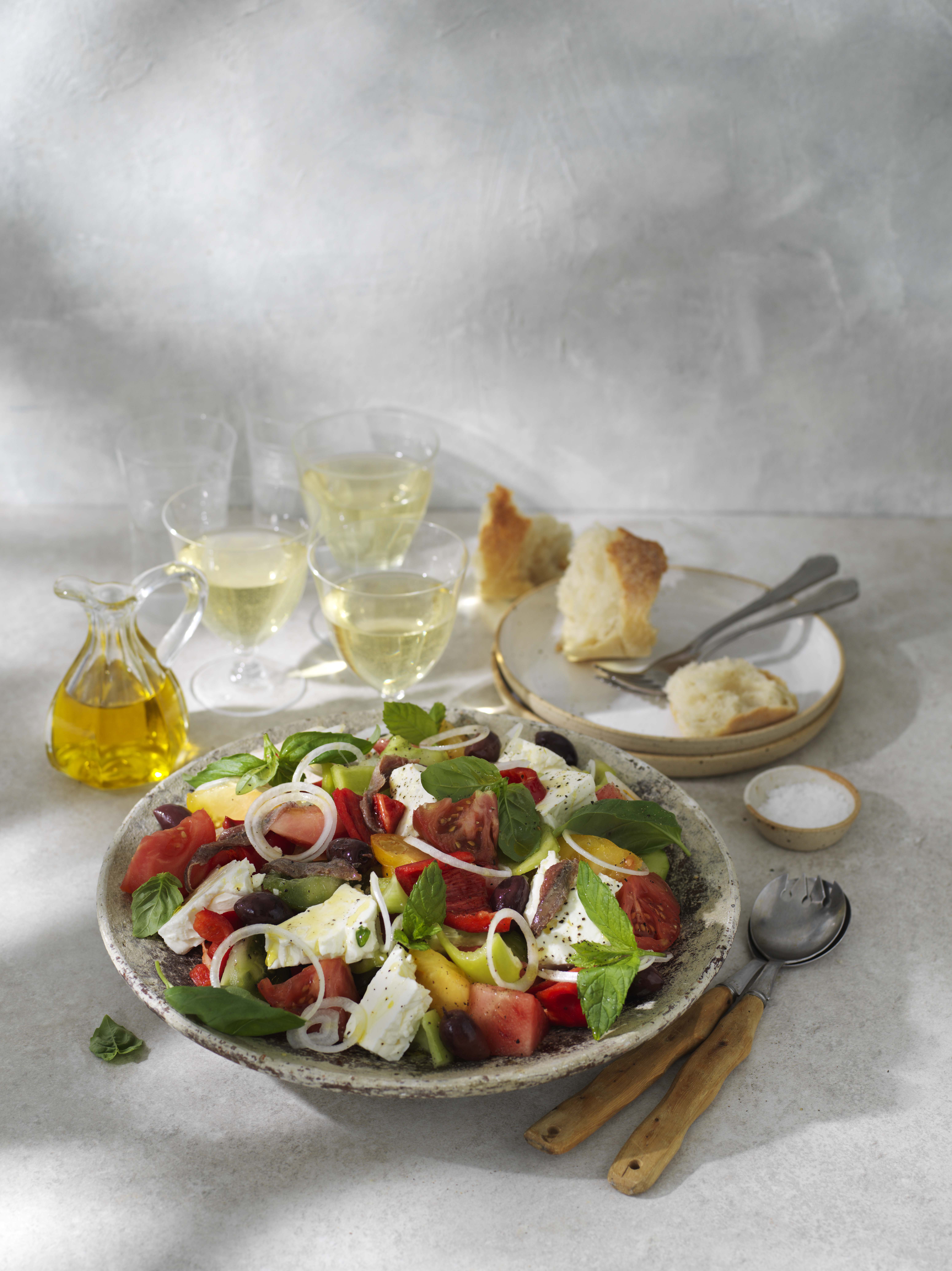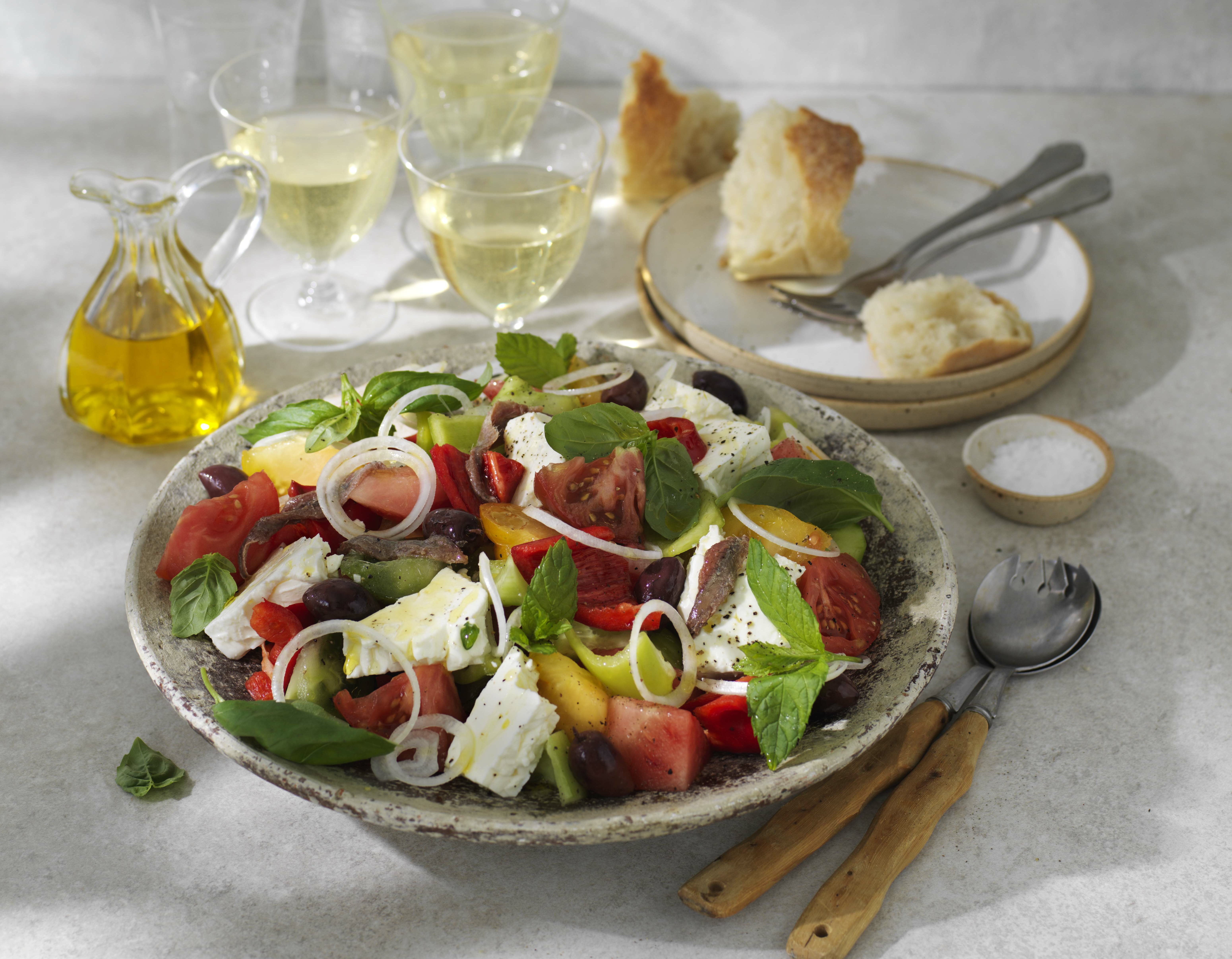 Solsken och värme, då är en grekisk sallad det ultimata lunchvalet. Här traditionellt serverad med fetaost och salta sardeller som blir underbart gott ihop med tomater och läskande vattenmelon.