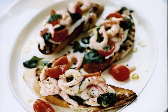 Krämig ricotta, räkor och färska örter på ett grillat bröd.