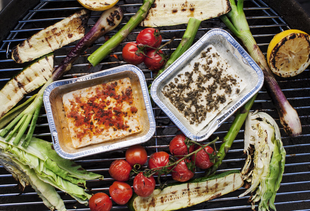 Grillad fetaost med sparris, spetskål, körsbärstomater, zucchini och färsk lök. Fetaosten blir härligt mjuk och krämig och serveras med fördel med en god olivolja.