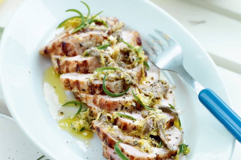 En blandning av klassiska italienska smaker som sardeller, vitlök, citron och rosmarin med skivad, grillad kotlettrad.