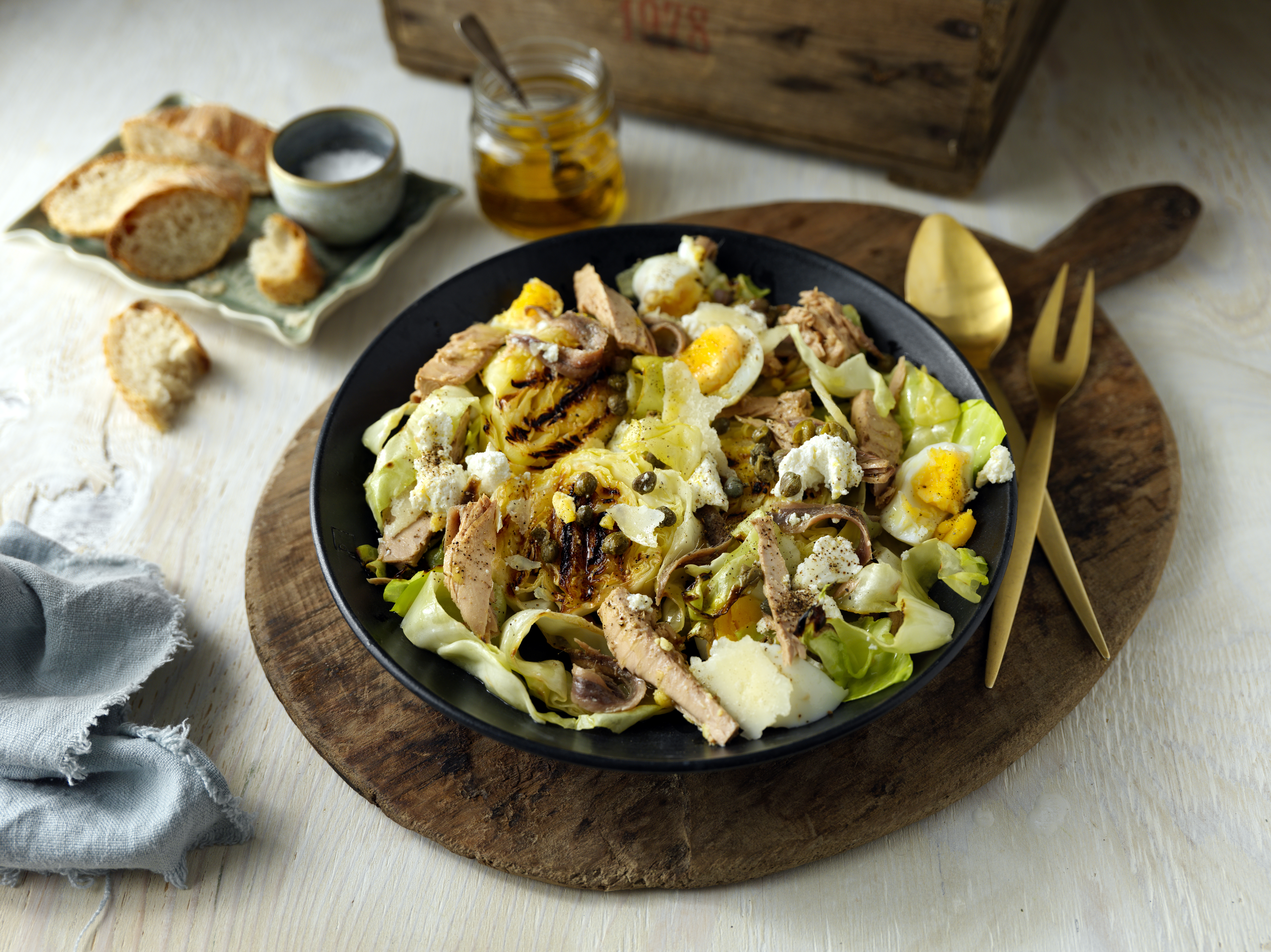 Tonfisksallad med kapris och grillad sommarkål. Salladen får sin sälta från sardellfiléerna. Passar fint när man ska grilla i sommar.