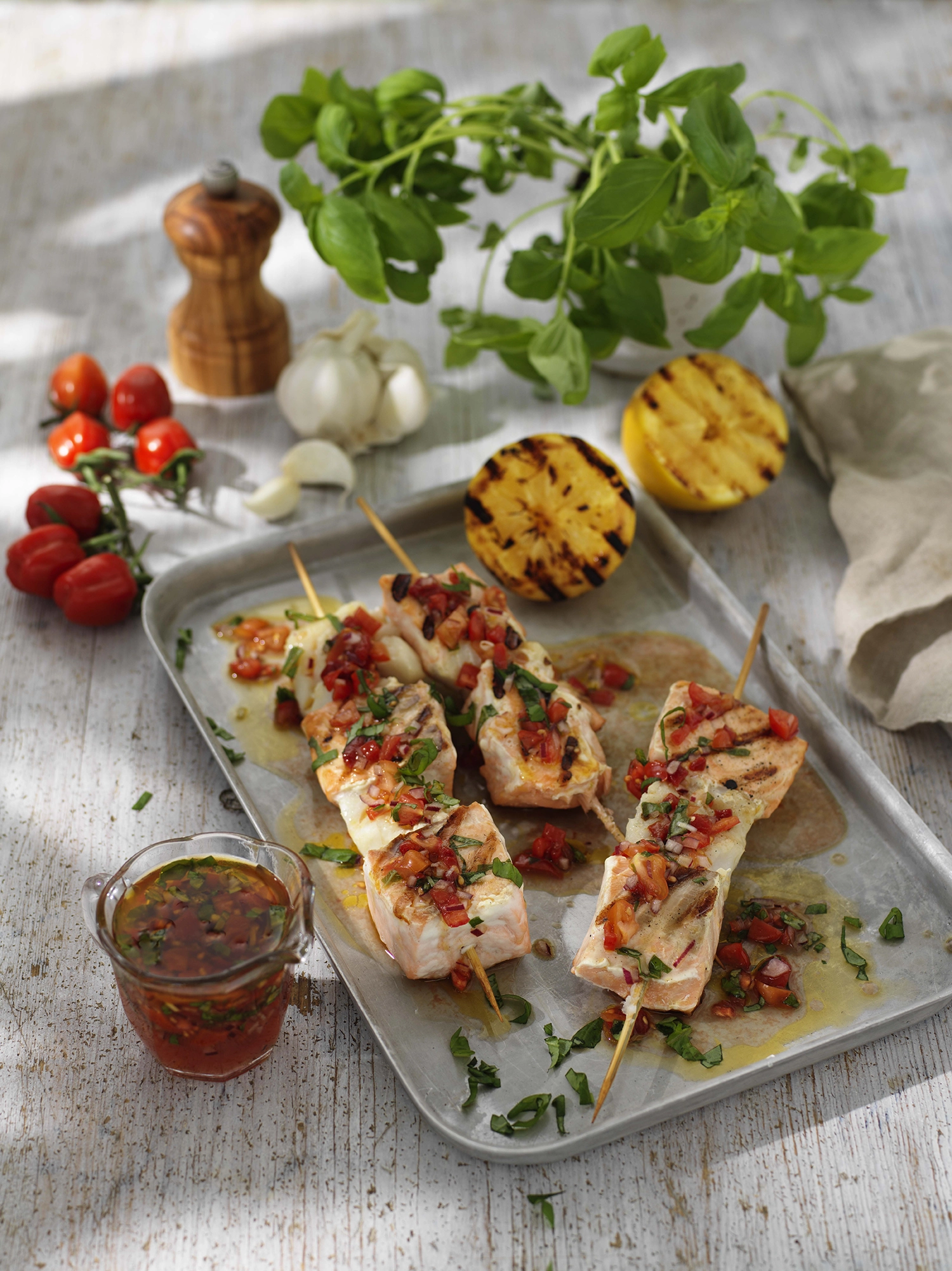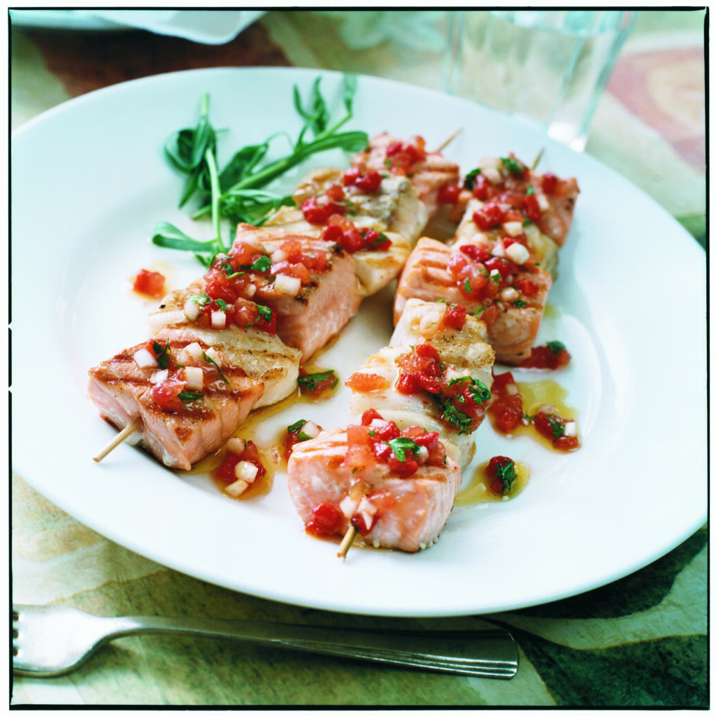 Grillat fiskspett med tomat & vitlöksvinägrett