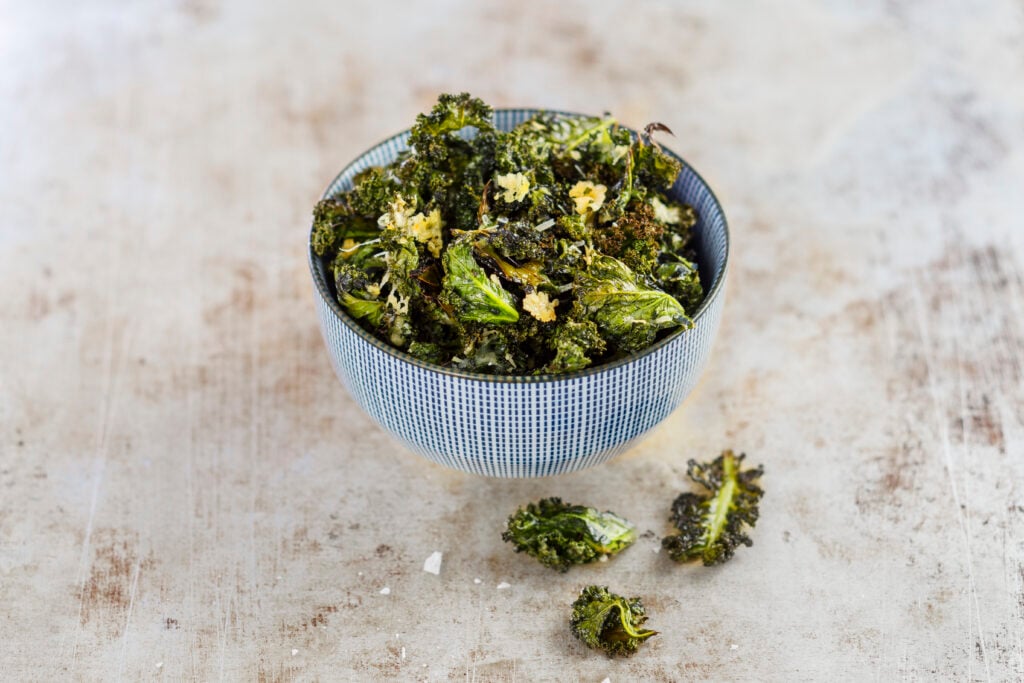 Krispiga grönkålschips med lagrad parmesan. Perfekt som tilltugg till drinken eller framför tvn.