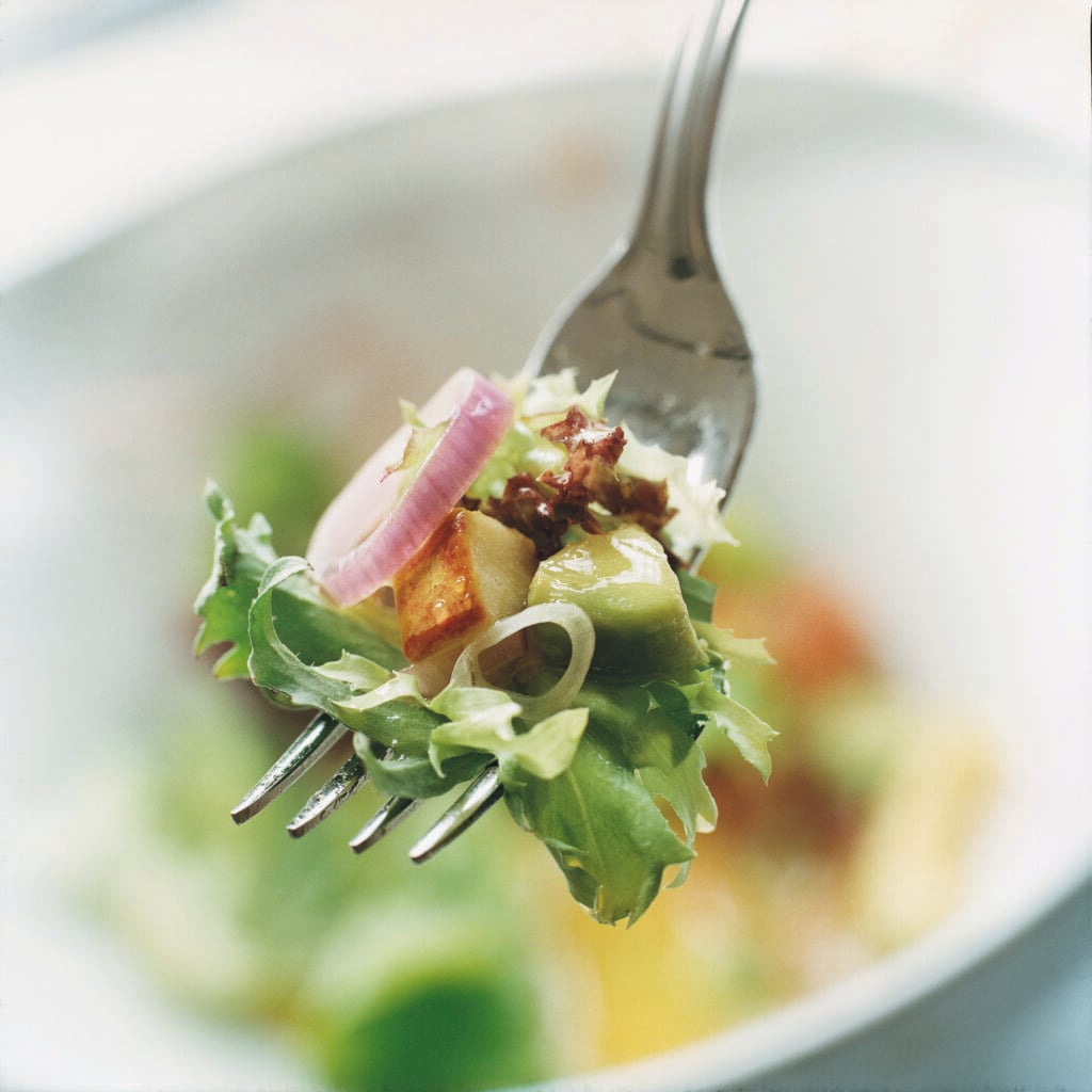 Grönsallad med mogen avokado, krispiga äpplen och en dressing med smak av mango. Passar som en enkel lunch eller som tillbehör till middagen.