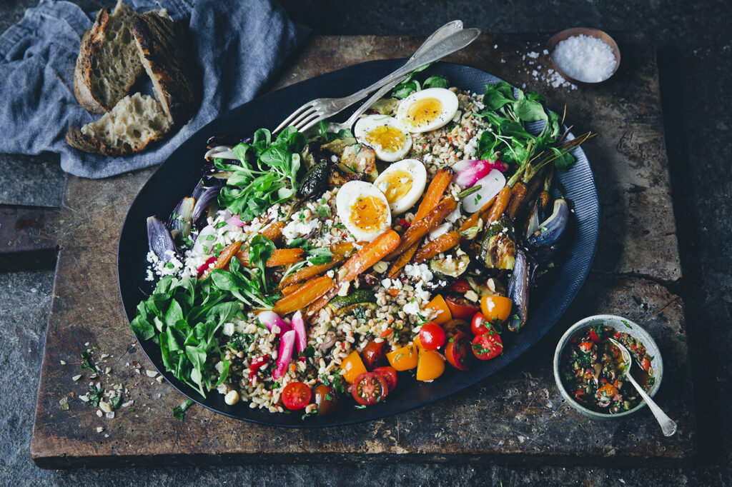 Denna grynsallad eller grain bowl bygger på att blanda gryner, rostade och färska grönsaker samt andra ingredienser till färgstarka matskålar. Grynerna utgör alltid den mättande grunden och sedan kan man improvisera i oändlighet beroende på vilka ingredienser som finns i säsong och i kylskåpet.
