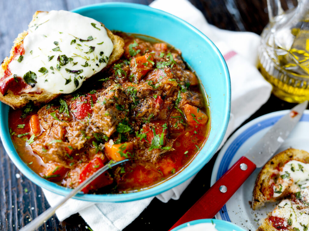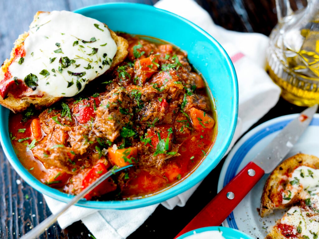 Gulaschsoppa med plommontomater, kummin och mejram är mustig och mättande. Servera med en klick gräddfil och ett gott surdegsbröd.