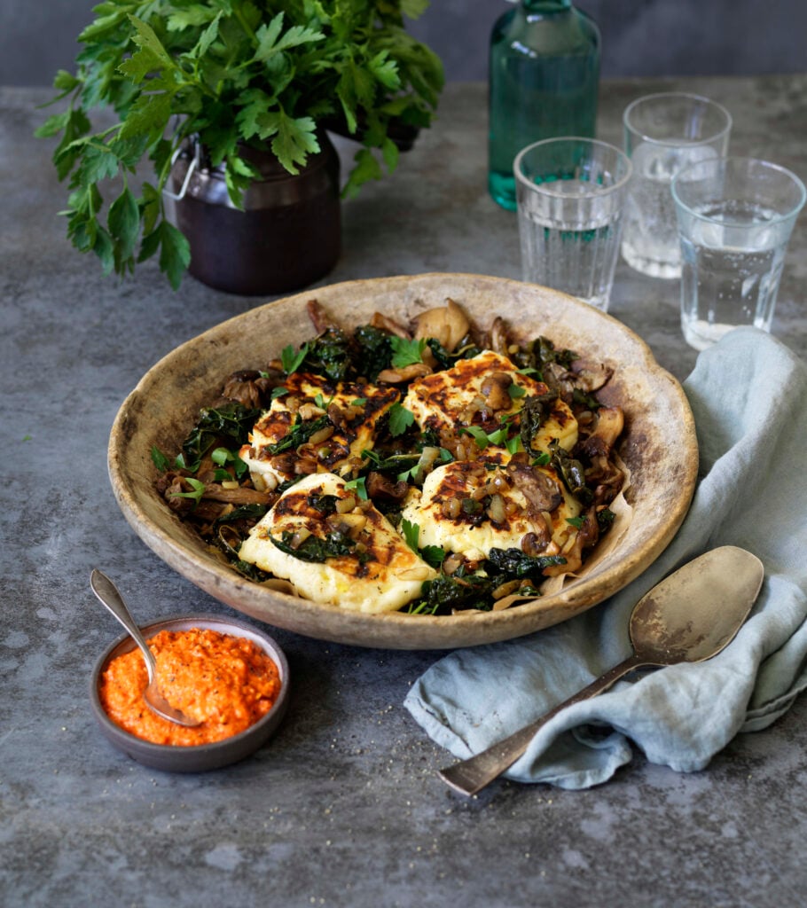 En enkel och snabblagad rätt med halloumi och svartkål. Ge den extra sting med romescosås.