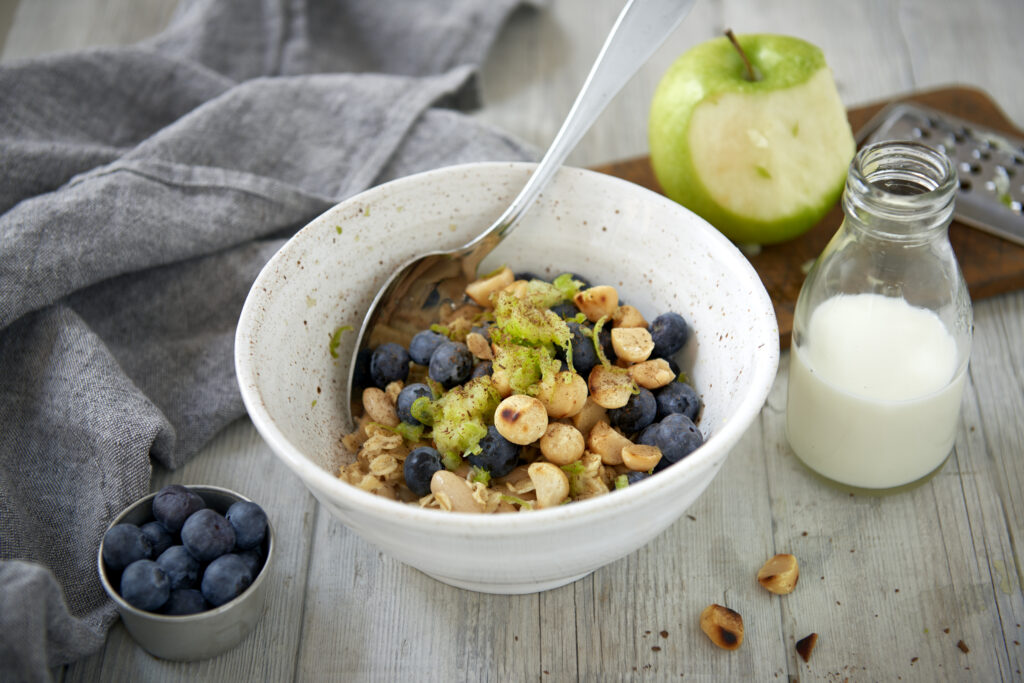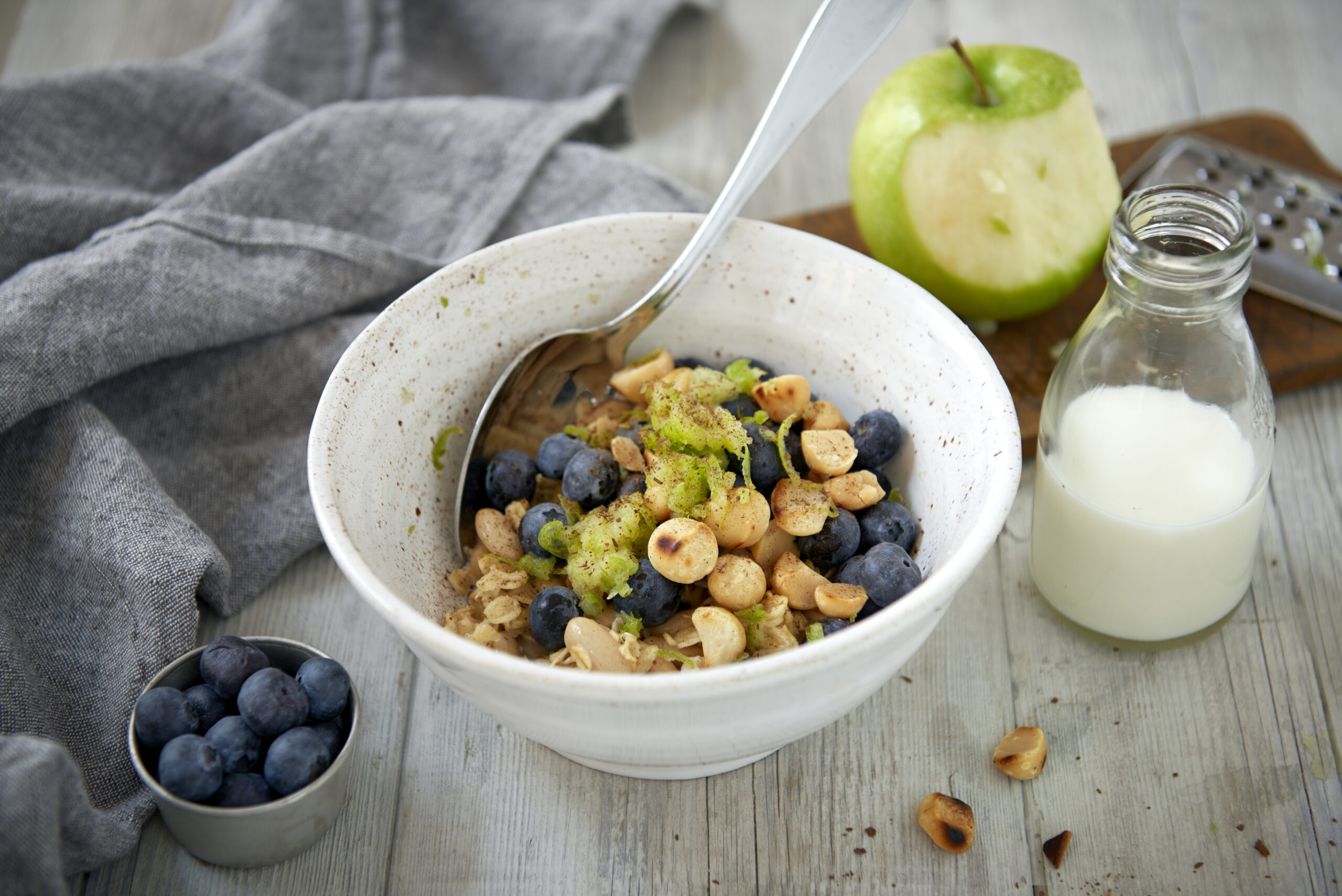 Havregrynsgröt med cannellinibönor. Toppas med blåbär och rivet äpple, avsluta med nötter och kardemumma.