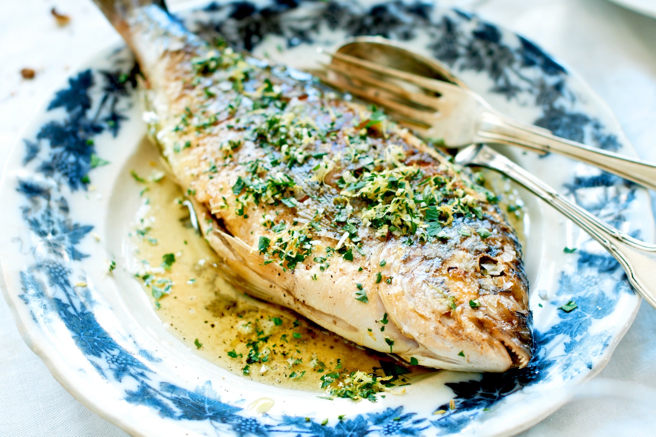 Helstekt Sea Bream är en ljuvlig fiskrätt smaksatt med väldoftande gremolata.