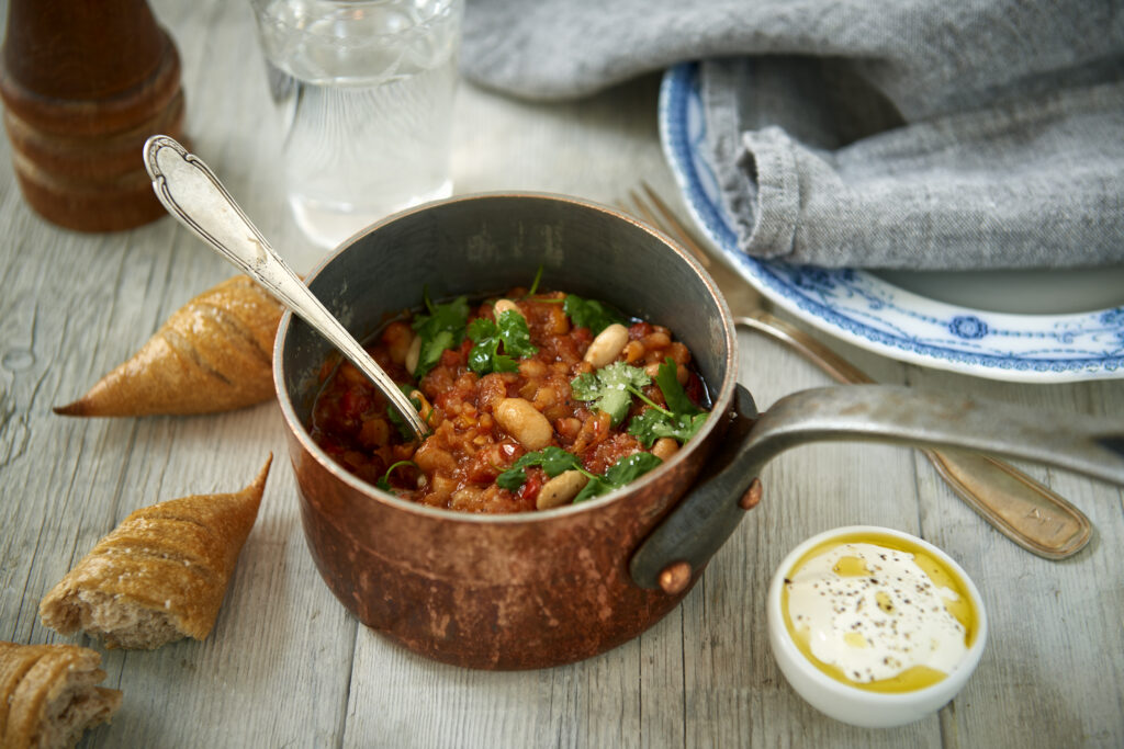 Vegetarisk böngryta med hetta från chili. Serveras med färsk koriander.