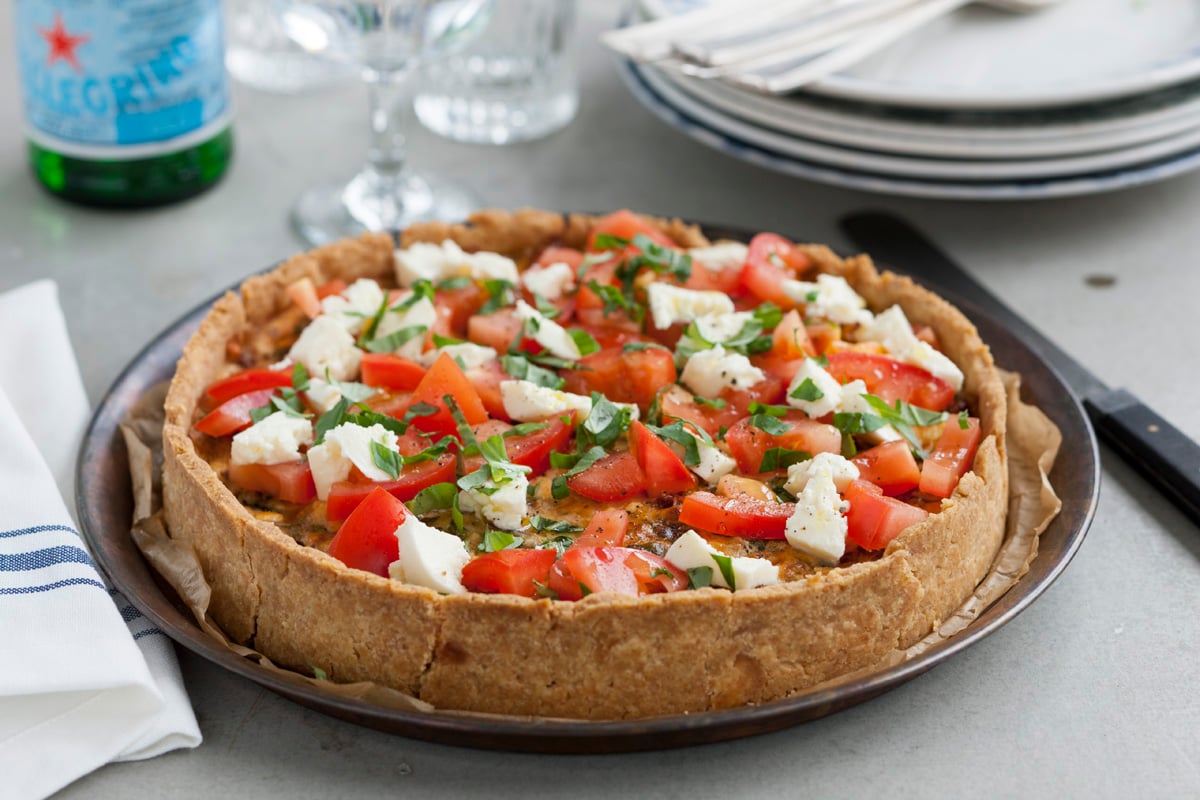 Festlig paj med klassiska italienska smaker som mozzarella, parmesan, tomat och basilika. Och ett litet gästspel av Grekland med en härligt varm och krämig fetaost. En rätt som passar utmärkt till fest eller varför inte till en helt vanlig vardag som behöver livas upp.