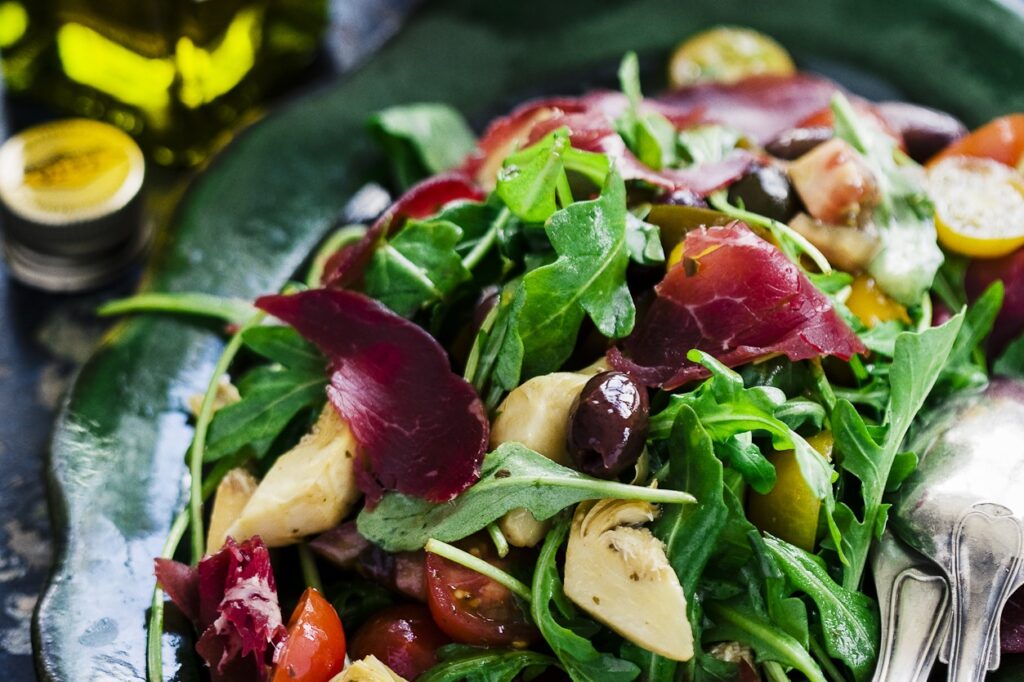 Sallad med italiensk bresaola, marinerade kronärtskockor, oliver och gröna blad. Toppas med en krämig dressing på gorgonzola och mascarpone.