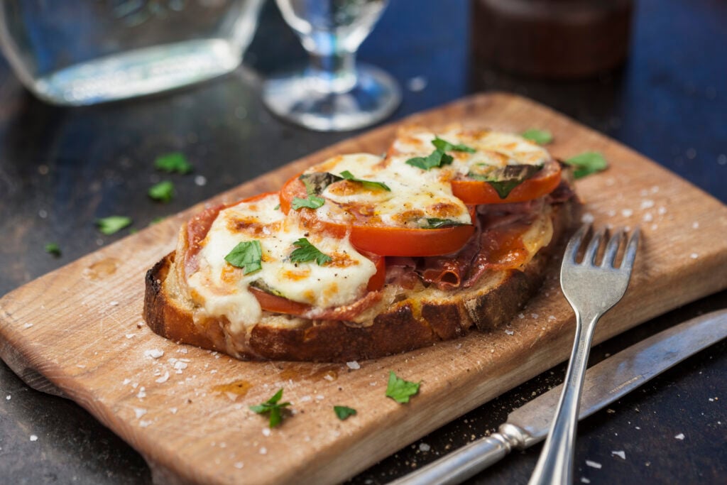 Varm surdegsmacka med mozzarella och lufttorkad skinka. Perfekt som en lättare lunch eller till en god soppa.
