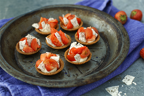 Tartelett med jordgubbar och tomater på en sötsyrlig mascarponekräm som toppas med maränger med svartpeppar. En spännande efterrätt som passar perfekt att bjuda på.