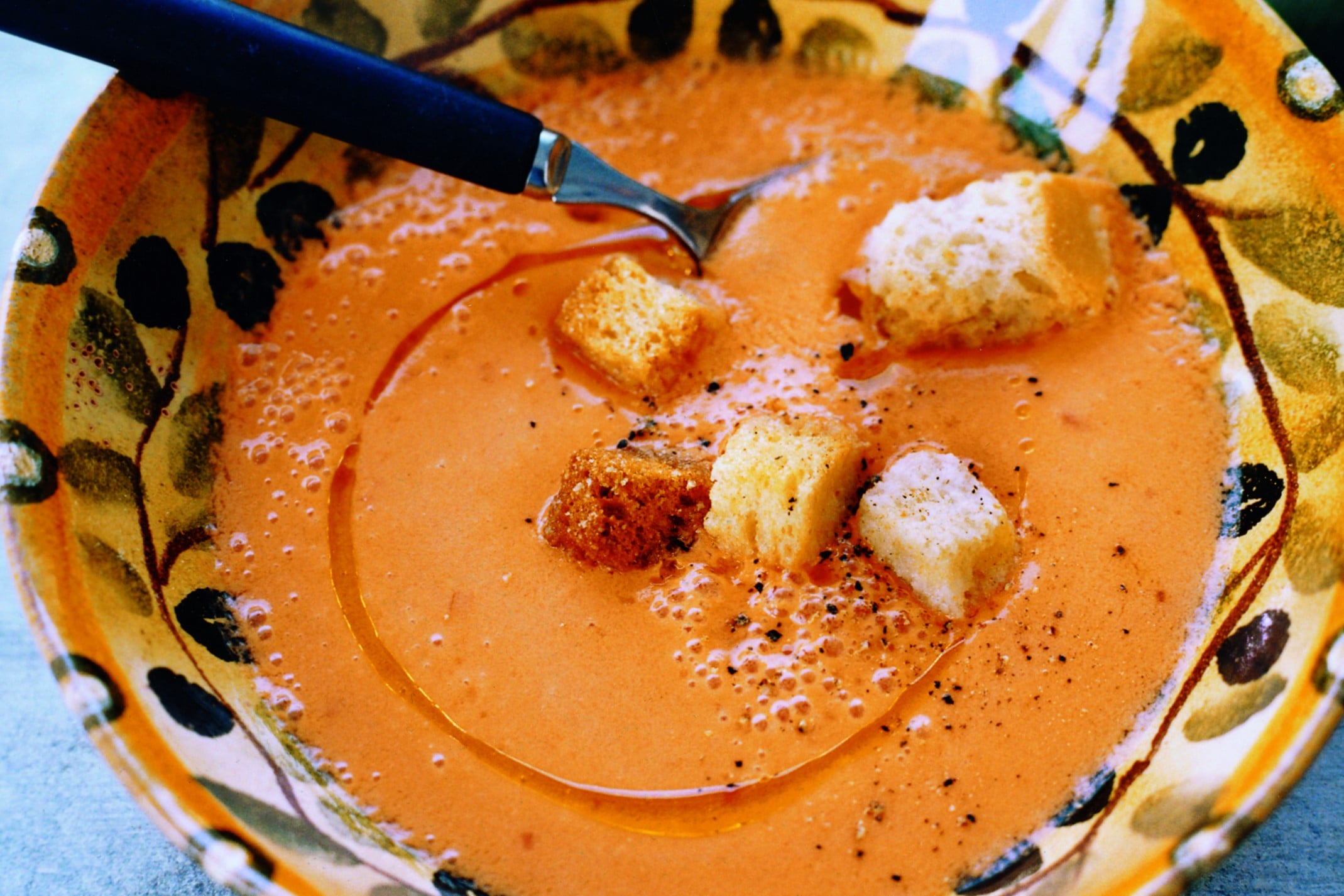 Gazpacho är soppa på paprika och tomat som ätes kall. Ringla gärna lite god olivolja på!