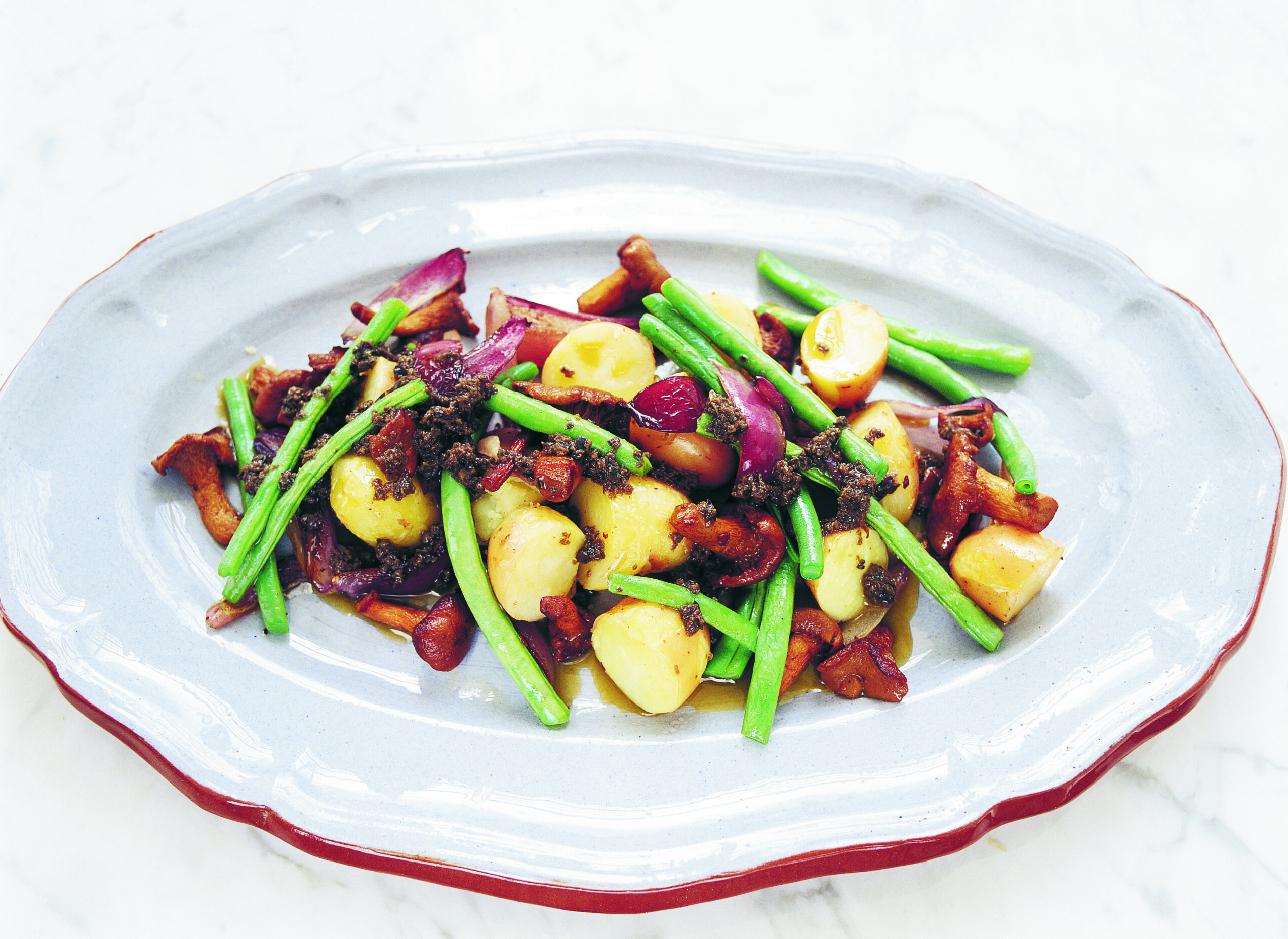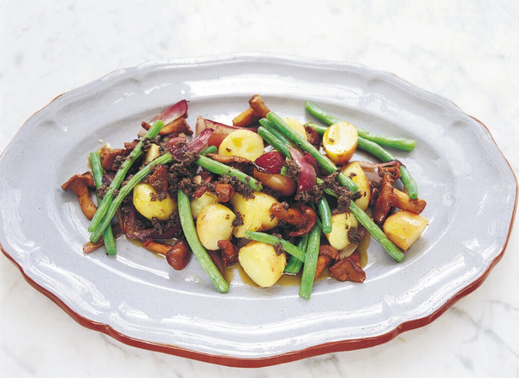 Kantareller med potatis, gröna bönor och en god vinägrett med tapenade av svarta oliver.