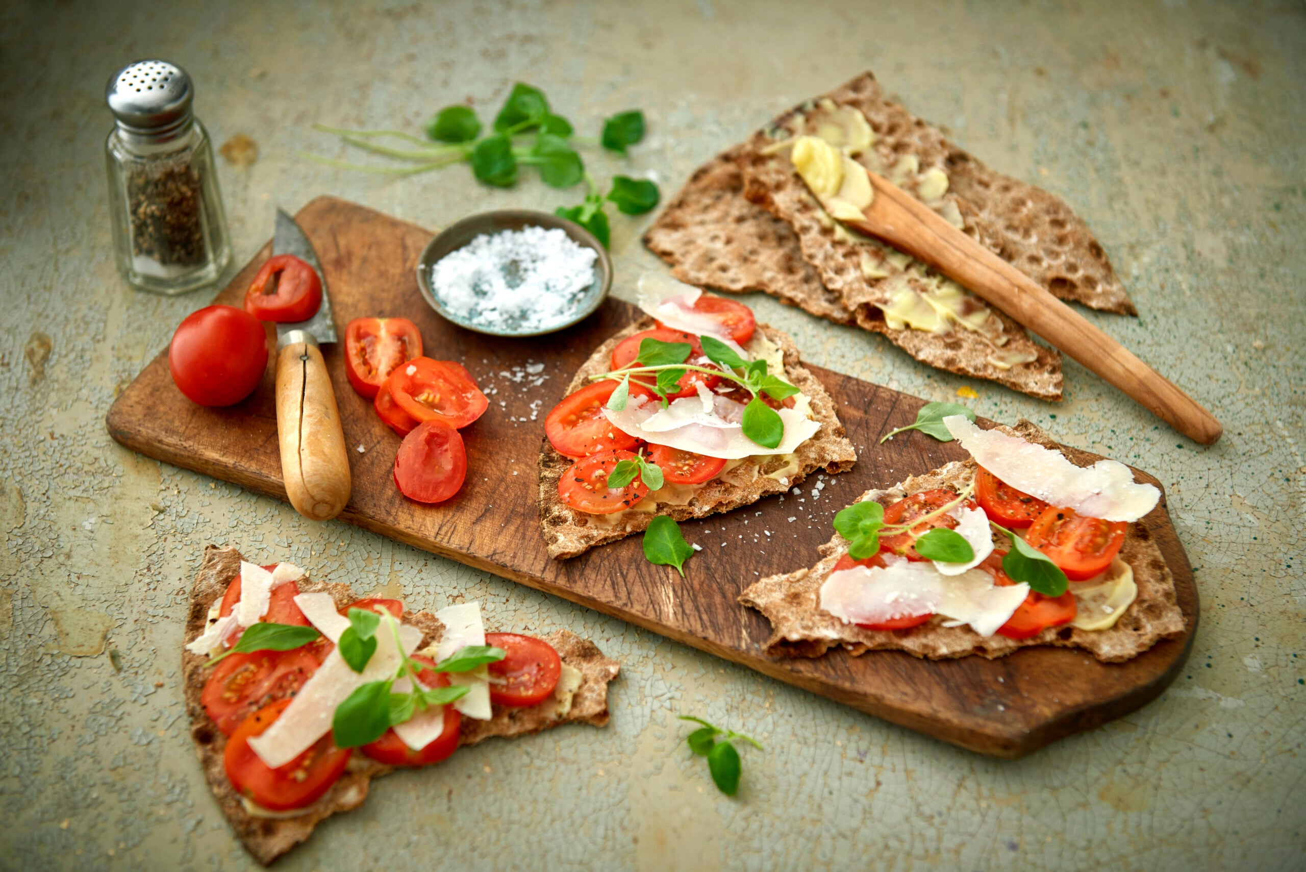 Knäckebröd med BreOliv, körsbärstomater och Grana Padano-ost. Klassisk svensk knäckemacka med italienska smaker. BreOliv är ett helt vegetabiliskt fett med bara fyra ingredienser, olivolja, fett från sheanötter, vatten och salt.