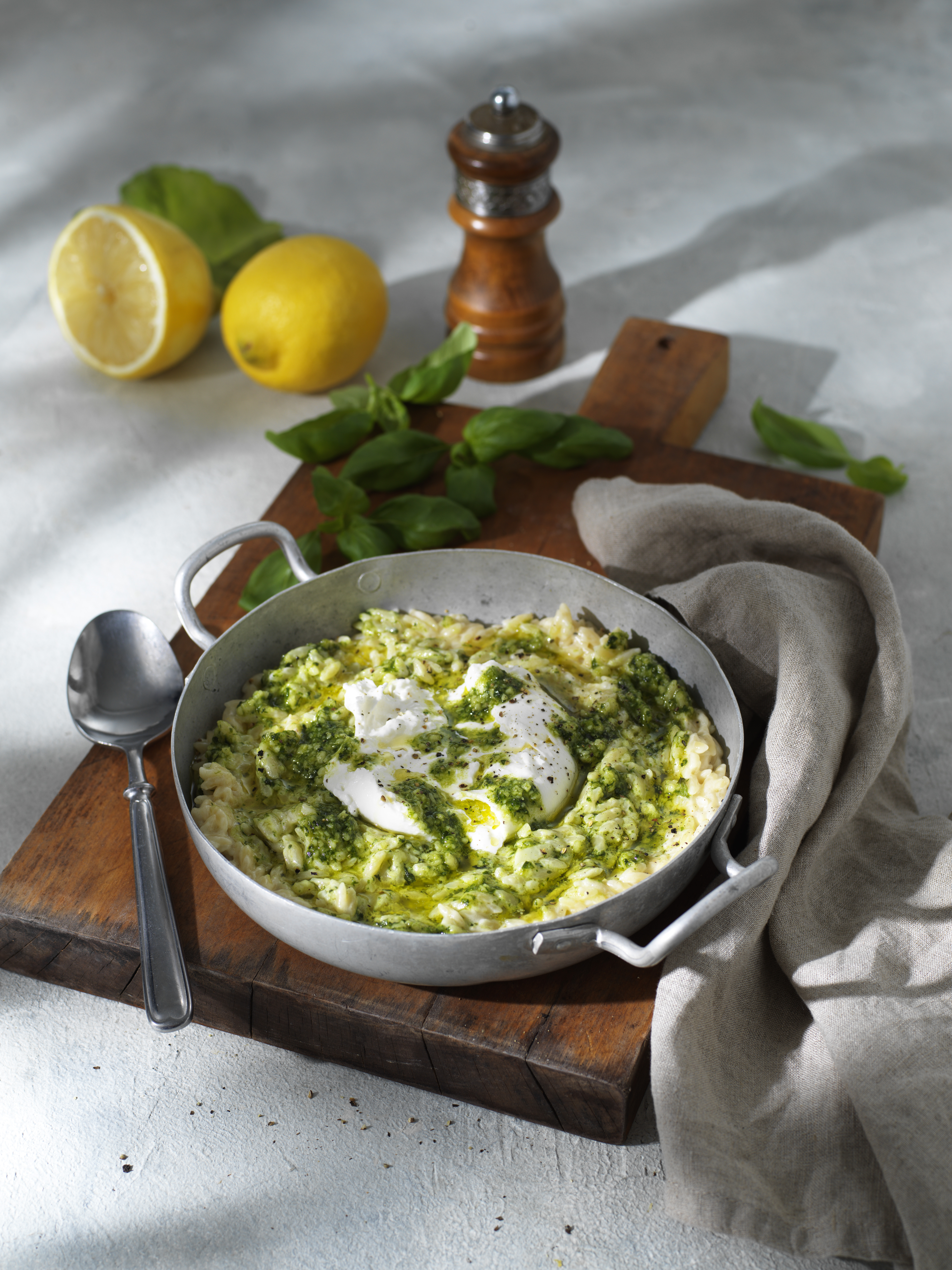 Den här krämiga risonin är som en snabbversion av en riktigt god risotto! Pesto och citron ger en god fräschör medan burrata som toppar rätten gör den extra krämig.