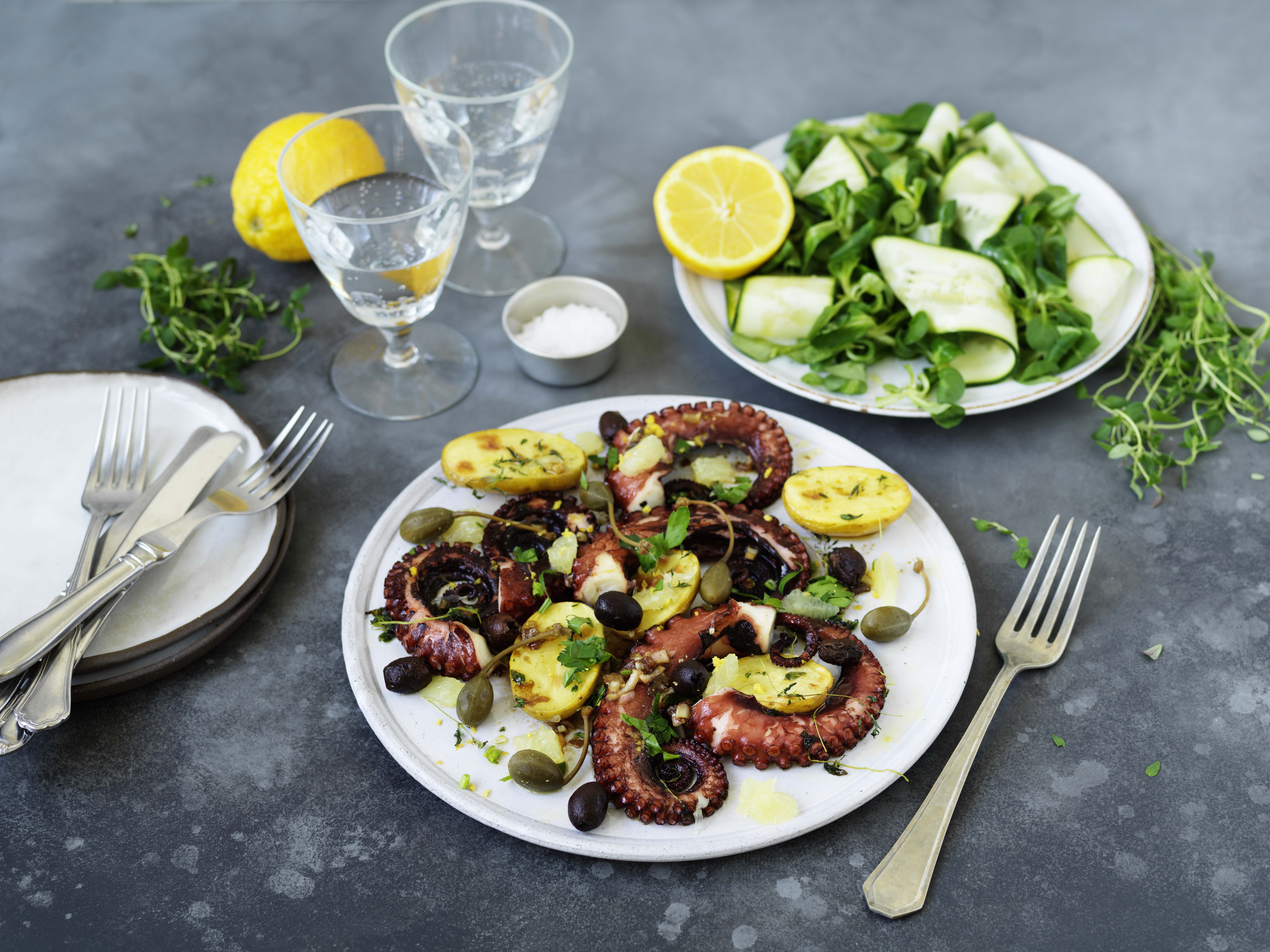 Krispig bläckfisk med oliver, kapris och rostad potatis