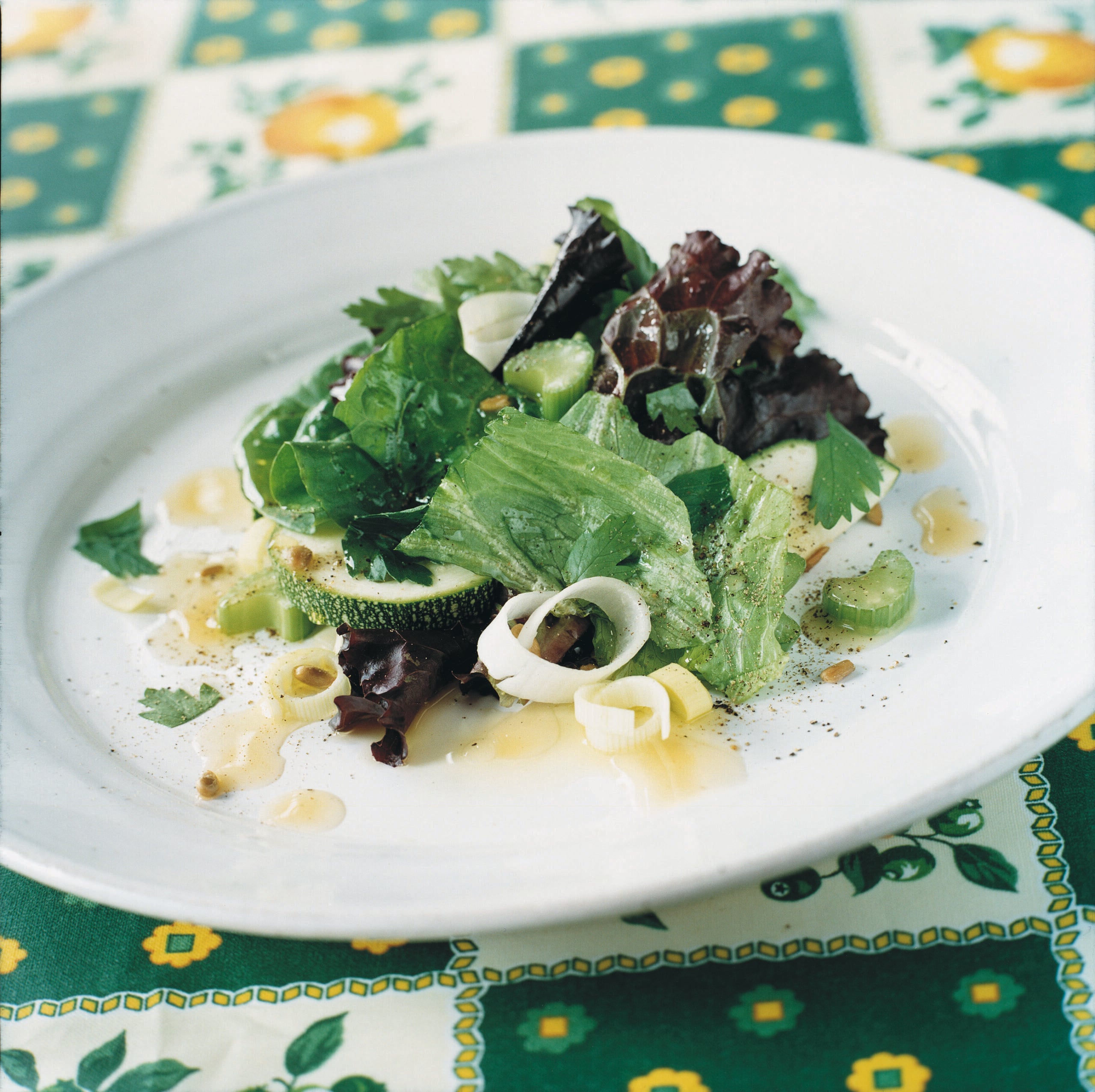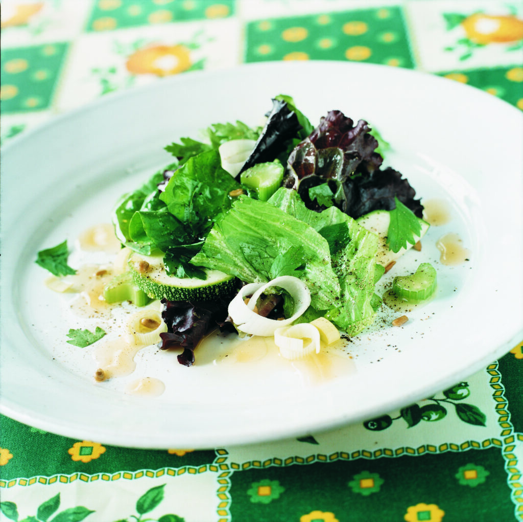 Vinägrett med smak av mango, blekselleri och gröna blad.