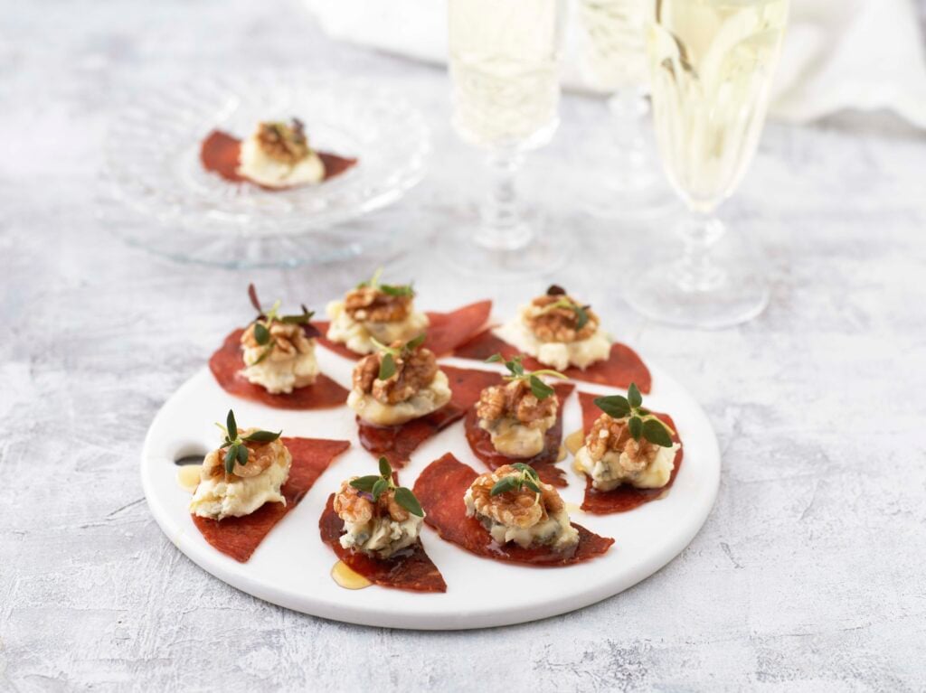 Krispiga salamichips med Gorgonzola, honung och valnötter. Utmärkt att servera som drinktilltugg som du snabbt förbereder.