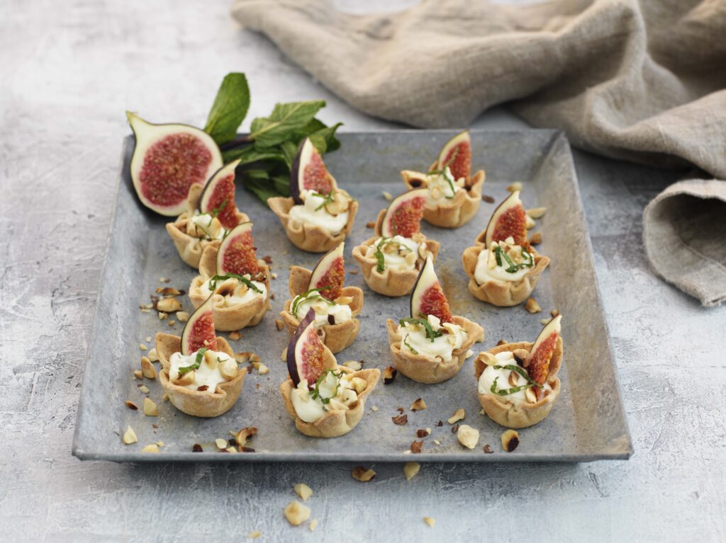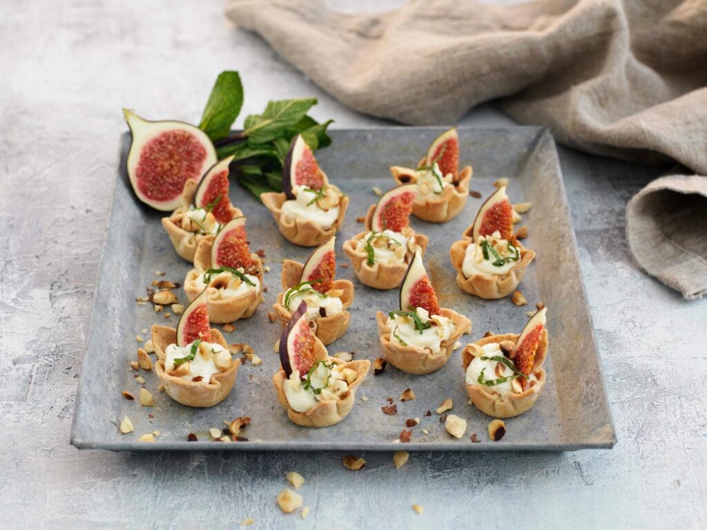 Perfekt plockmat till festen och nyårsskålen! Fetaostkrämen bryts av med krispigheten från krustader och rostade nötter. Färska fikon är pricken över i!