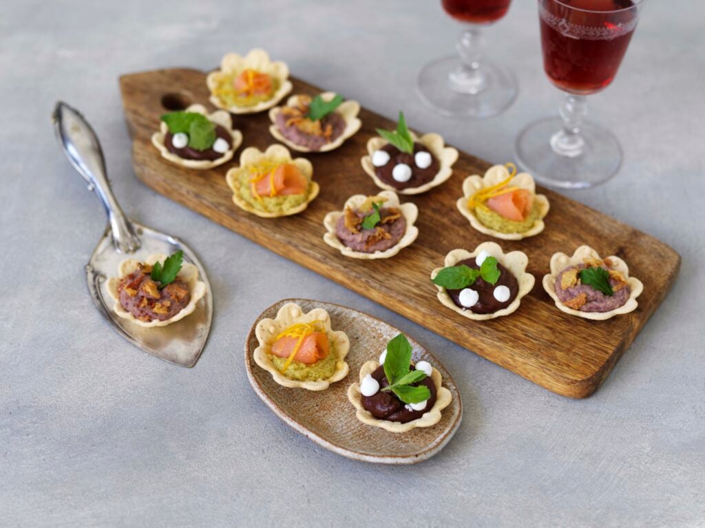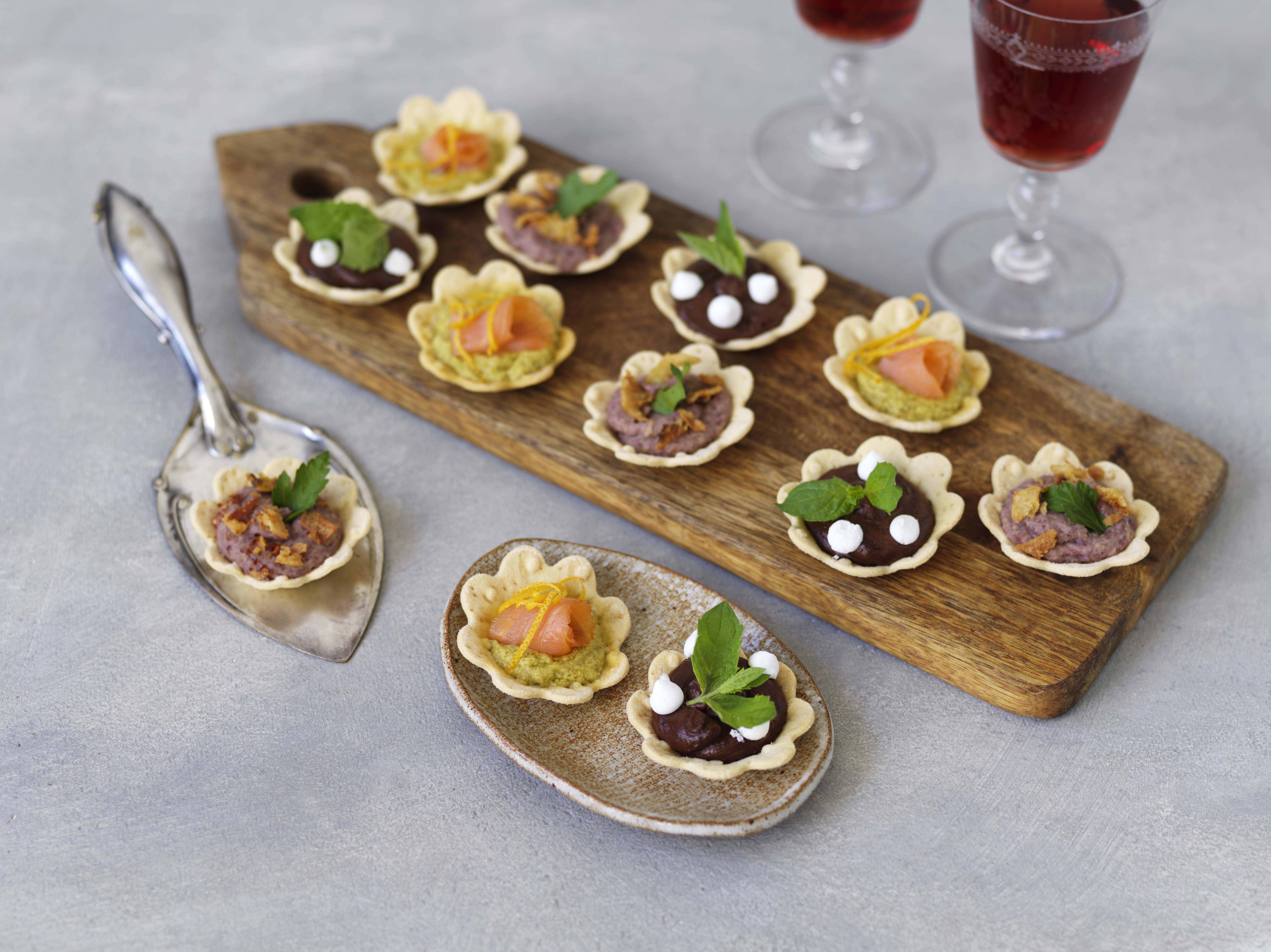 Festliga krustader som passar utmärkt att servera som tilltugg till minglet och drinken. Med variation av söta och salta krustader kan alla välja sin favorit.
