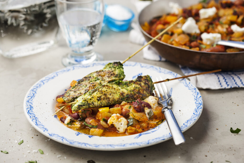 Saftiga örtmarinerade kycklingspett med ratatouille. Gott att grilla!