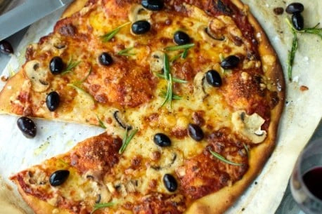 Hemlagad pizza är svår att överträffa. Klassiskt recept på pizza med tomatsås, mozzarella, oliver, champinjoner och rosmarin.