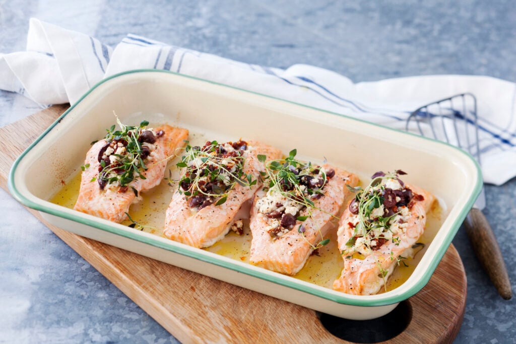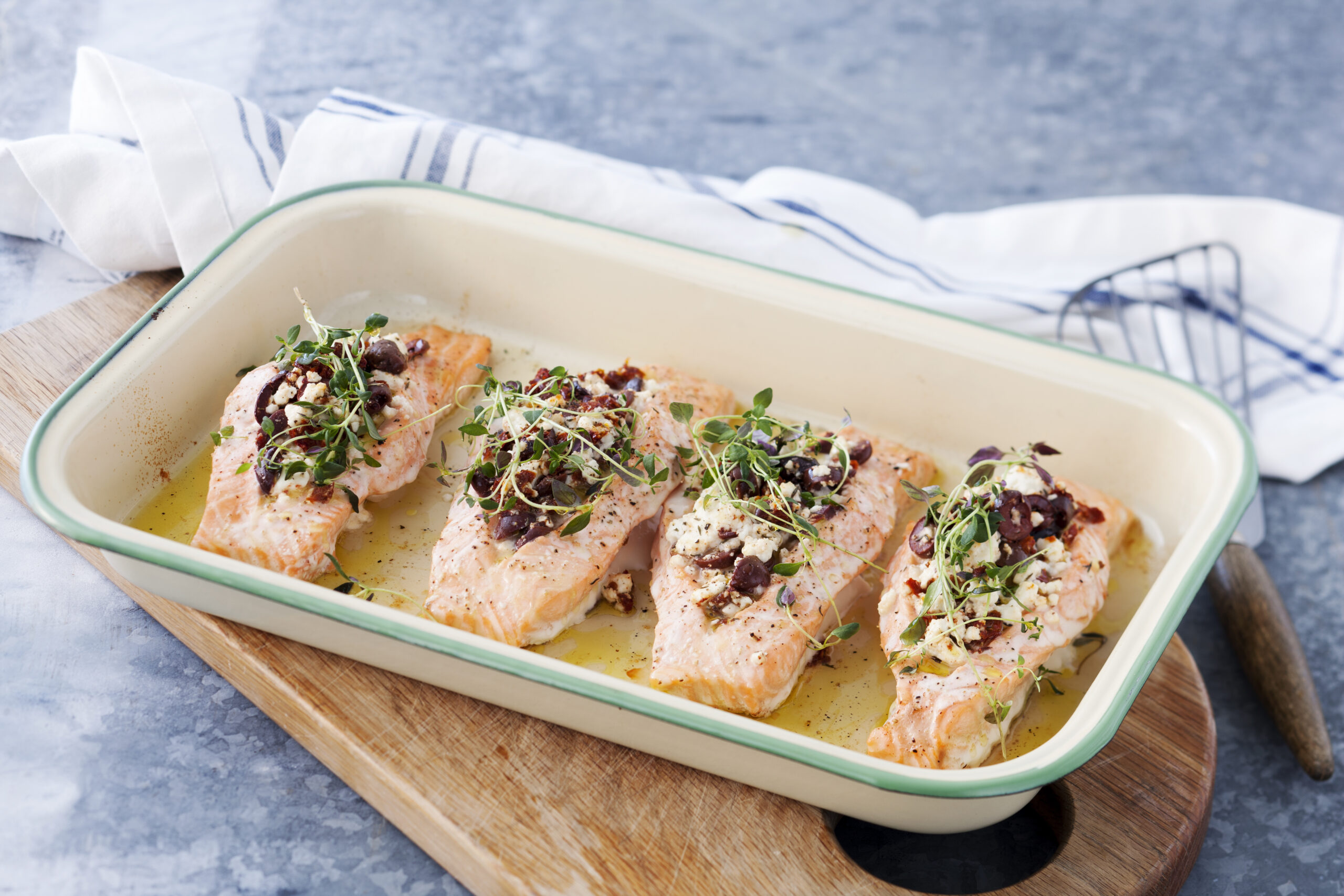 Servera den här ugnsbakade laxen med fetaost, oliver och soltorkade tomater till en gryn- eller bönsallad.