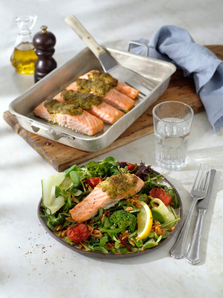 Receptet beskrivs som att enbart lax med pesto är en rätt. Krävs inte sallad eller/och pasta/ris till för att servera detta?