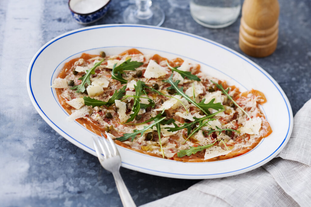 En härlig och snabblagad laxcarpaccio till säsongens buffé med färdig kronärtskockskräm, sardellkräm, parmesan och kapris.