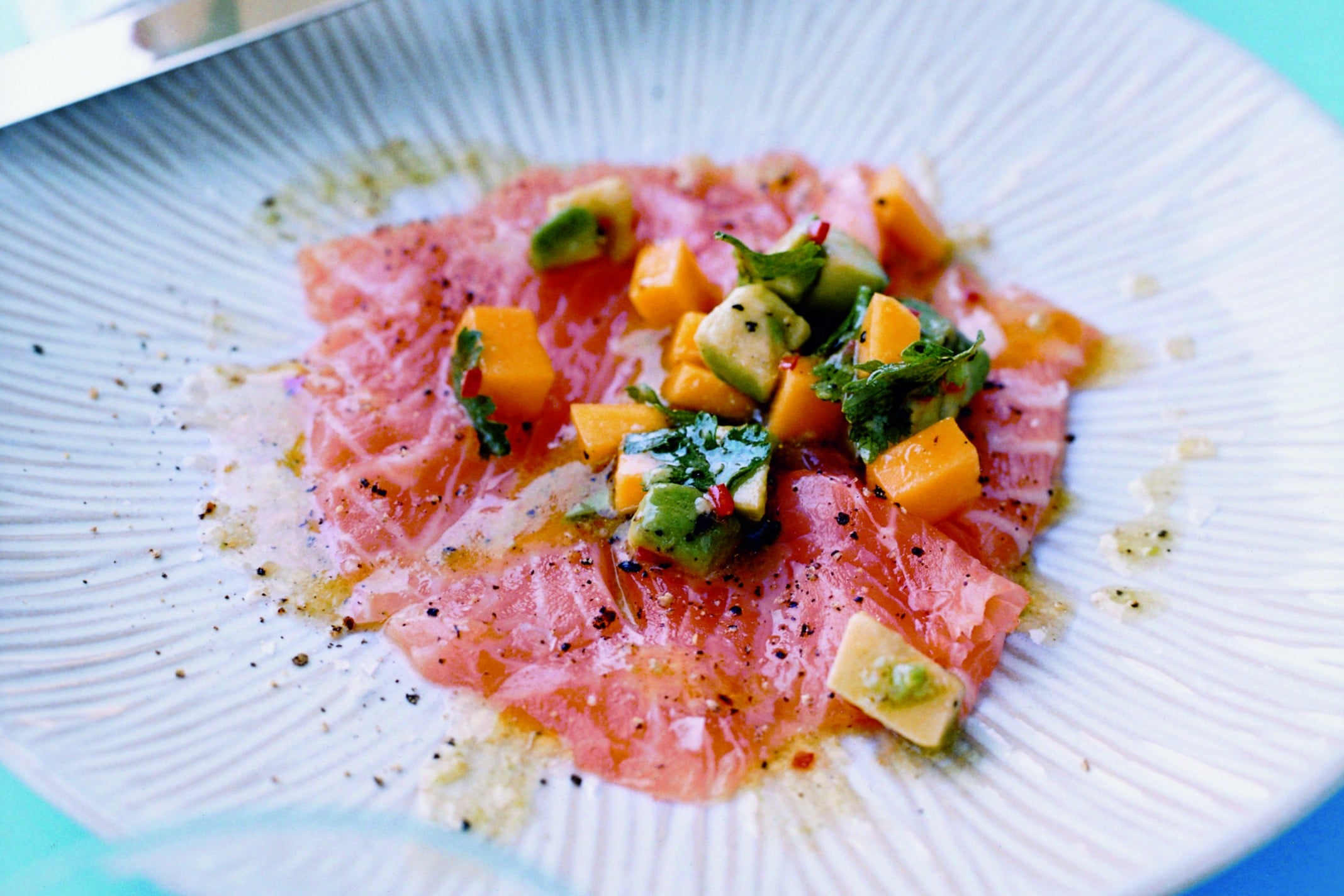 Fruktig och frisk laxcarpaccio med avokado och mango, smaksatt med chilivinägrett med sting.
