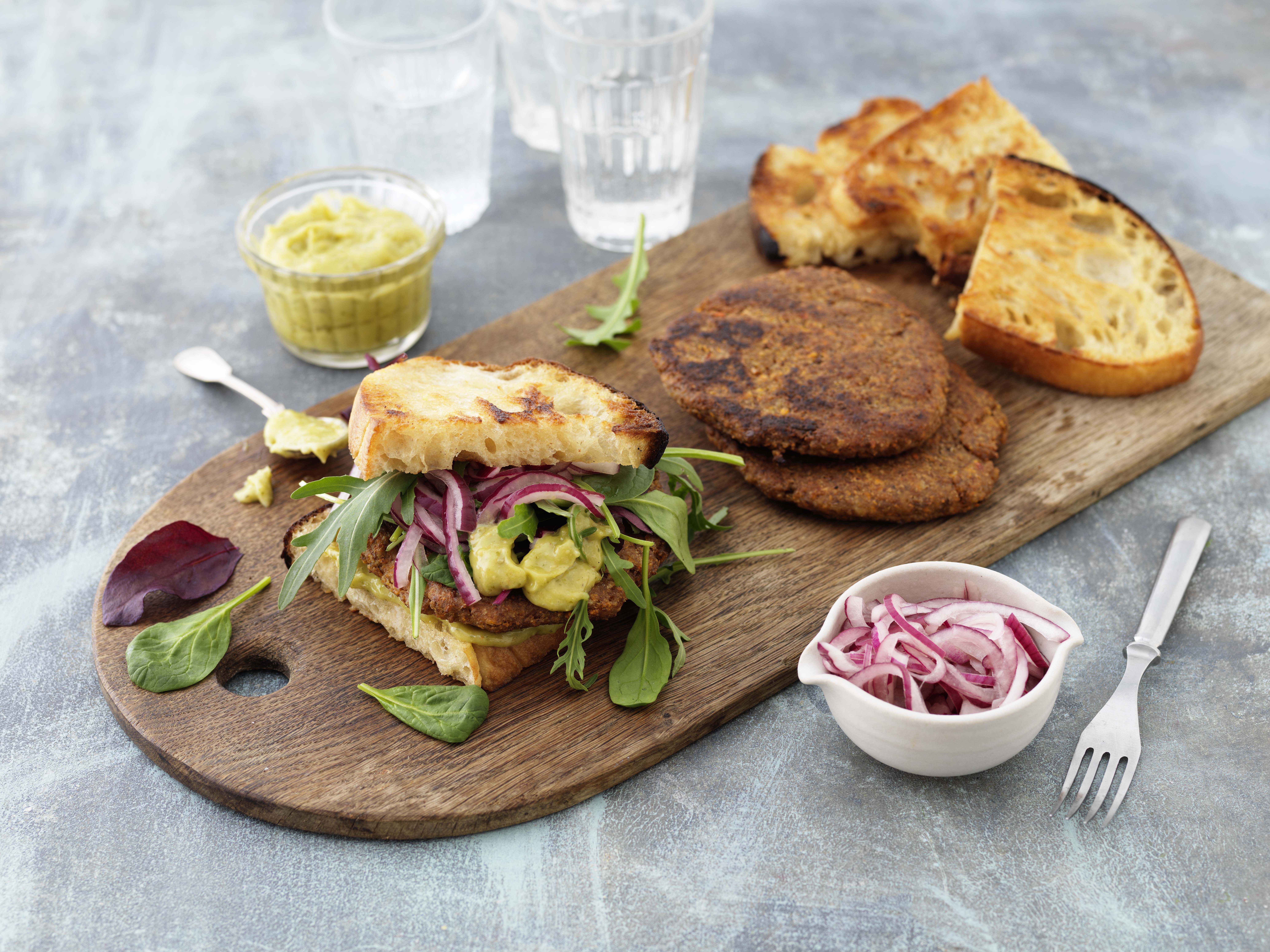 Smakrik vegetarisk burgare, med röda linser istället för kött. Pestomajonnäs och picklad rödlök är goda tillbehör. Servera i surdegsbröd med sallad.