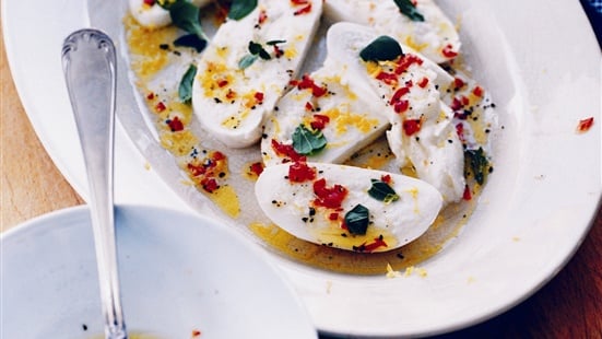 Mozzarella som marineras med en mix av citron och chili som sedan toppas med mejram. Utmärkt som förrätt eller plockmat.