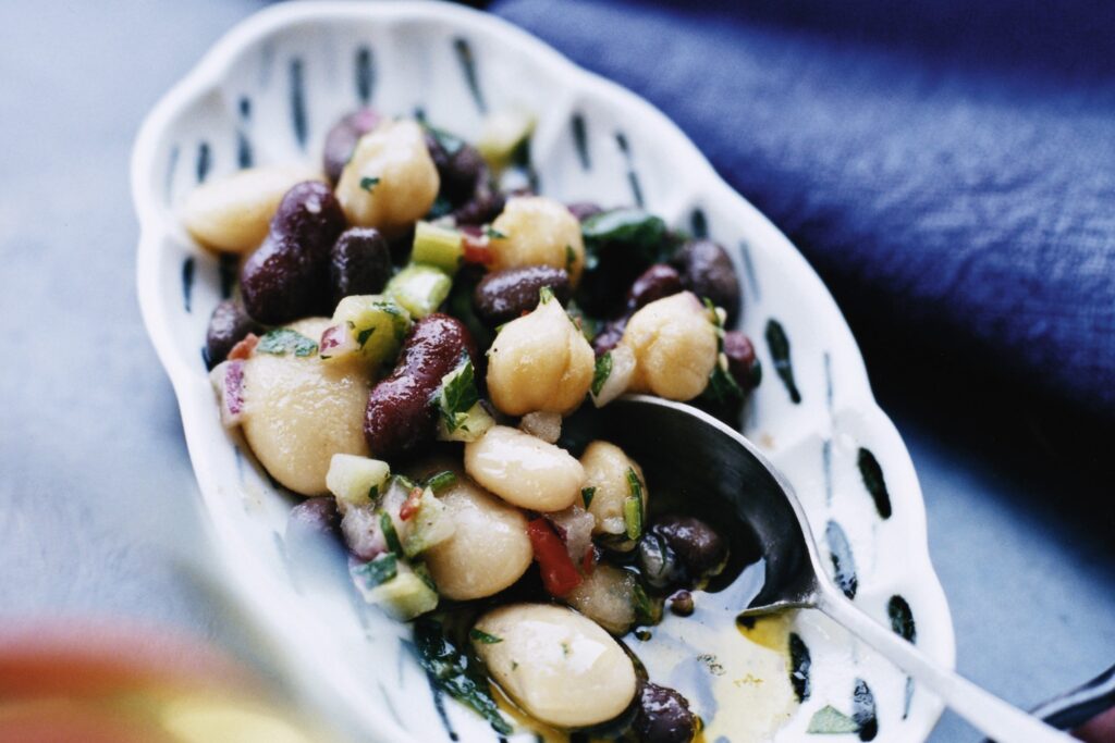 Blandade marinerade bönor; kidneybönor, stora vita bönor, svarta bönor smaksatt med blekselleri, lök och chili.