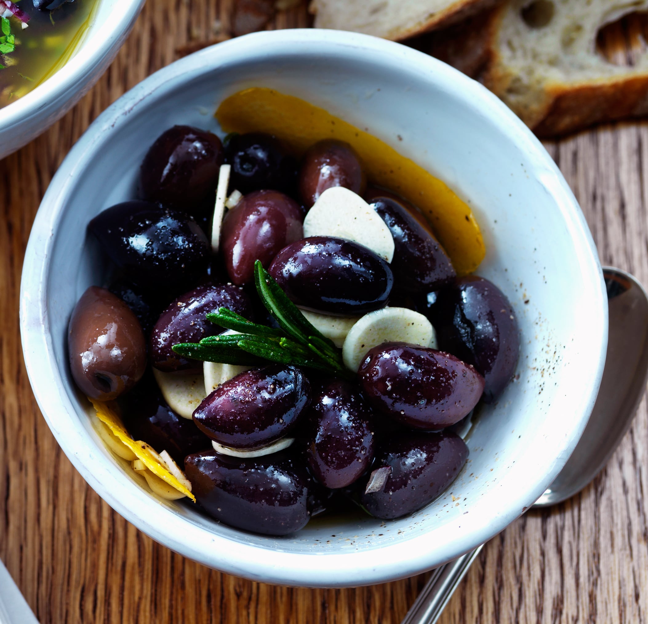 Oliverna får en fräsch smak av att marineras i citron och rosmarin. Vitlöken lyfter smaken och gör oliverna till perfekta tilltugg.