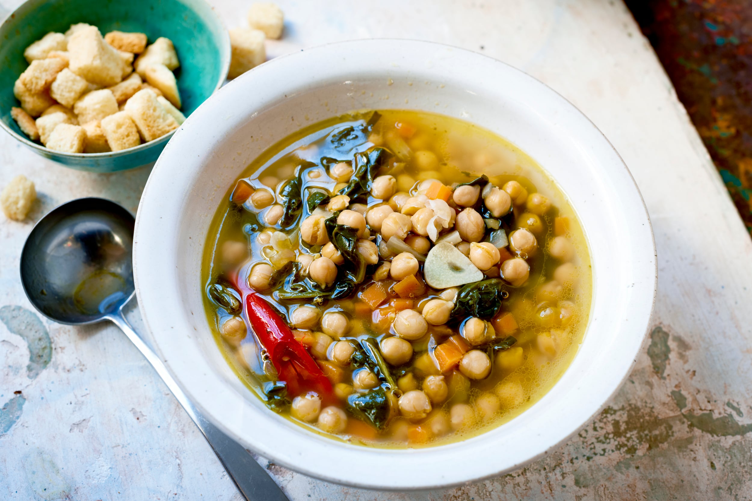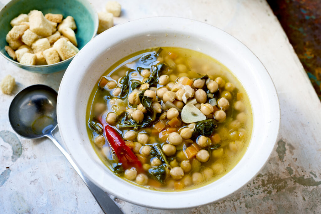 Kikärtssoppa serverad med krutonger och ringlad olivolja mättar fint.